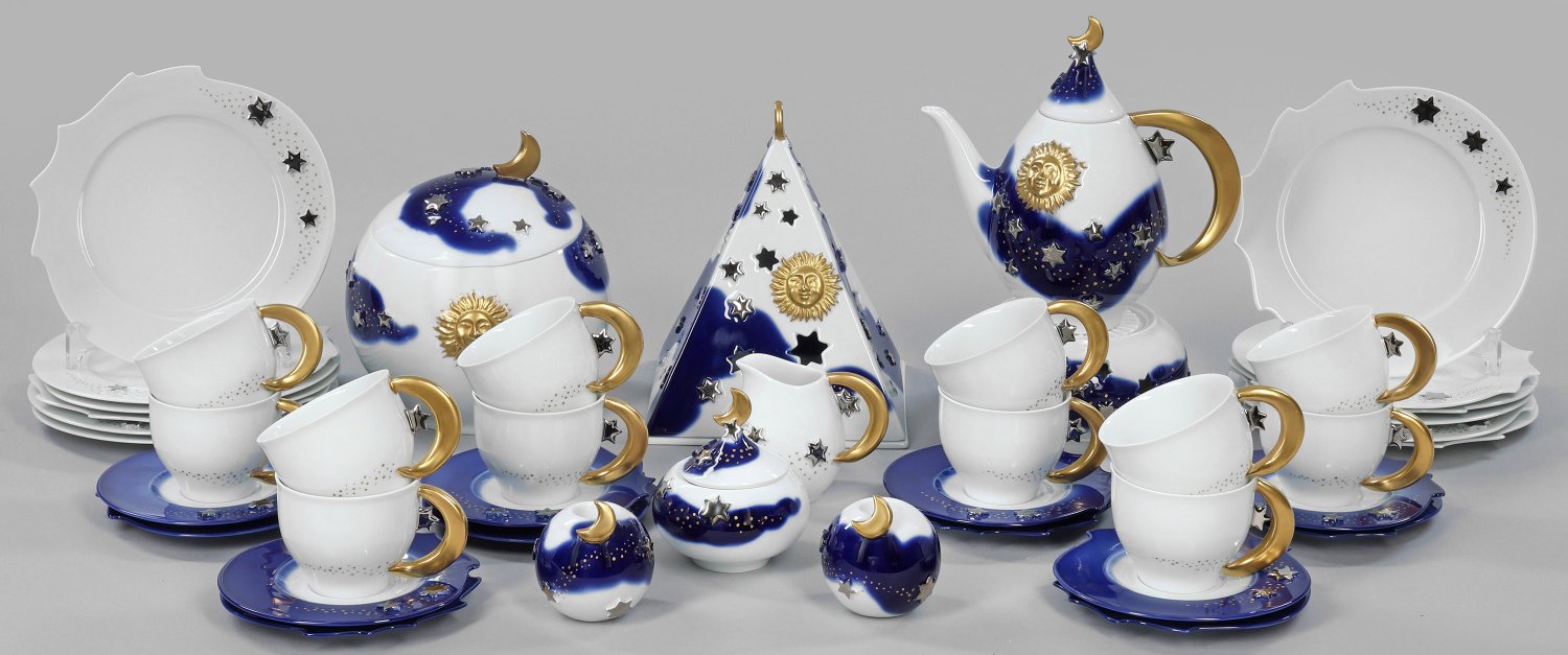 Kaffeeservice "Kosmos" von Barbara Flügel für 12 Personen. 32-tlg.; Kaffeekanne, Zuckerdose, Sahnegießer, 12 Tassen mit Untertassen. 12 Kuchenteller, Stövchen, Gebäckdose, 2 Kerzenhalter, Teelichthalter in Pyramidenform. Prächtiger, reliefierter Dekor aus Sonne, Mond und Sternen. Unterglasurblaue Malerei mit Poliergold- und Platinstaffage. Manufakturmarke. Teelichthalter-H. 23 cm.