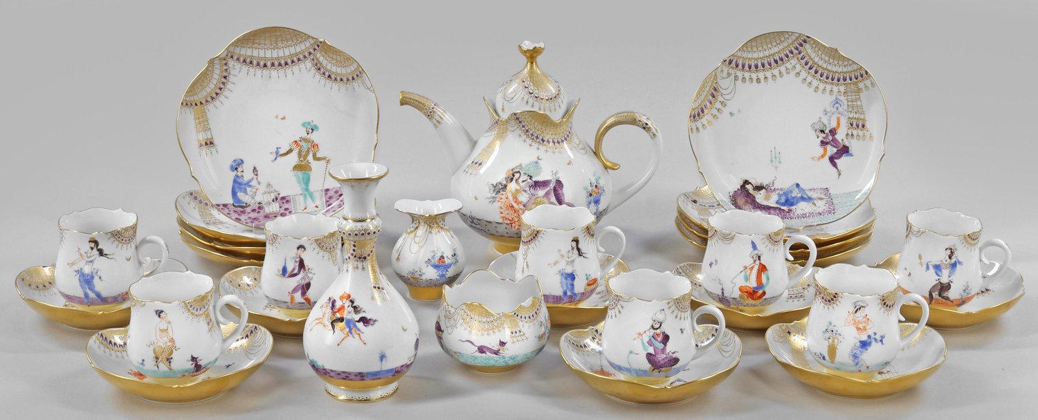 für acht Personen. 20-tlg.; Kaffeekanne, Sahnegießer, Zuckerschale, 8 Tassen mit Untertassen, 8 Kuchenteller, Vase. Form "Großer Ausschnitt". Auf der Wandung und im Spiegel stilisierte Darstellungen mit Szenen bzw. Interieurs aus den Erzählungen "1001 Nacht". Form-Entw. Ludwig Zepner, Dekor-Entw. Heinz Werner. Polychrome Malerei mit reichem Poliergolddekor. Außenwandung der Teller vergoldet. Zuckerschale besch.; Schwertermarke. Kannen-H. 20 cm.