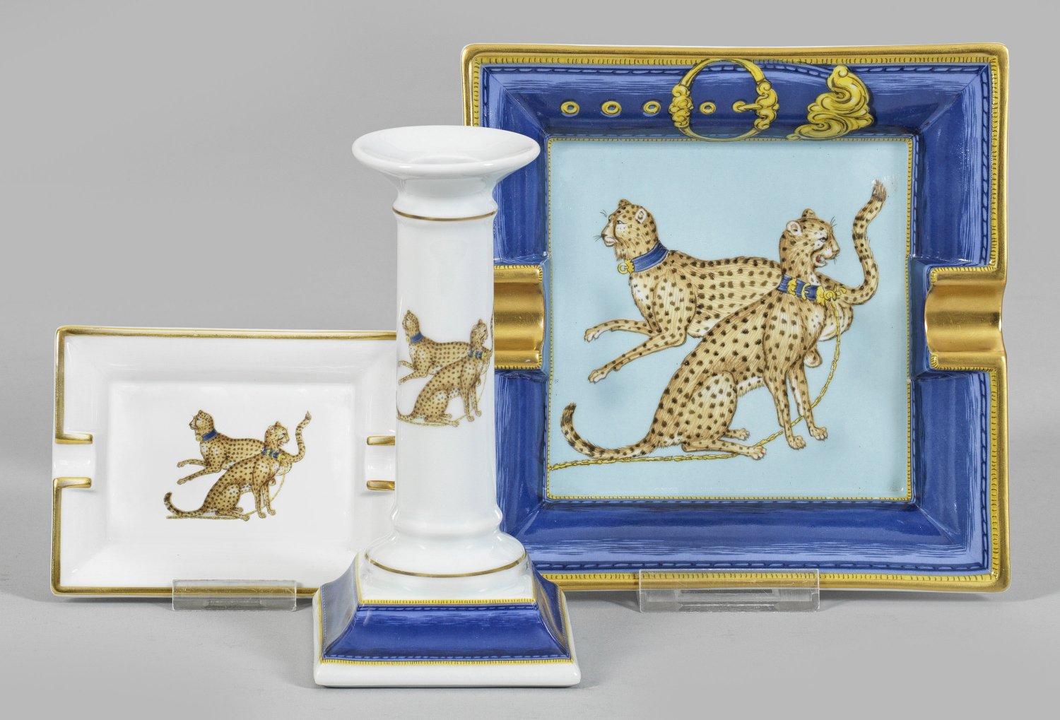 Farbiger Dekor mit Geparden, teilw. Motiv einer Gürtelschließe. Reiche Goldstaffage. Manufakturmarke. Kerzenhalter-H. 17 cm. 9 cm - 18 cm. x 11 cm - 18 cm.