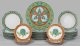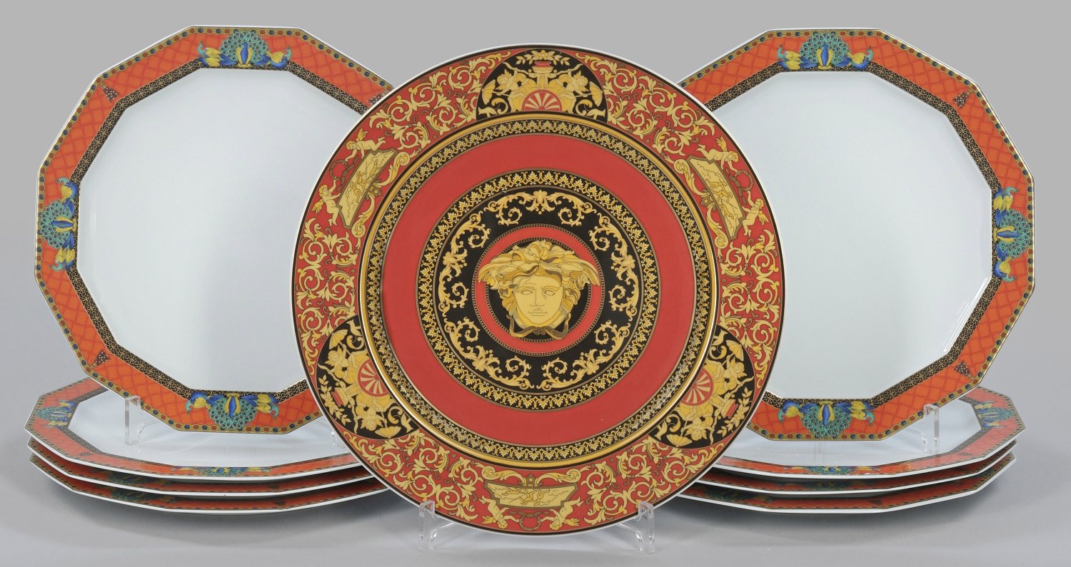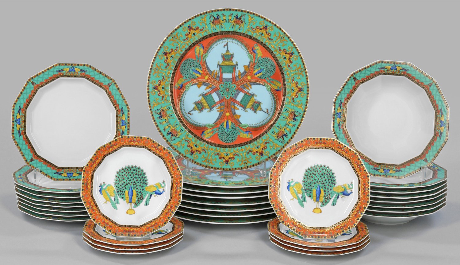 für 8 Personen. 40-tlg.; 8 Platzteller, 8 Speise-, 8 Vorspeisen-, 8 Suppen-, 8 Brotteller. Runde sowie achteckige Form. Farbenprächtiger Dekor aus Architektur-, Pfauen- und Kamelmotiven sowie verschiedenen Ornamentbordüren auf smaragdgrünem und orangerotem Fond. Beigabe: Platzteller "Medusa" von Versace. Minim. best.; Manufakturmarke. Teller-D. 17,5 cm - 31 cm.
