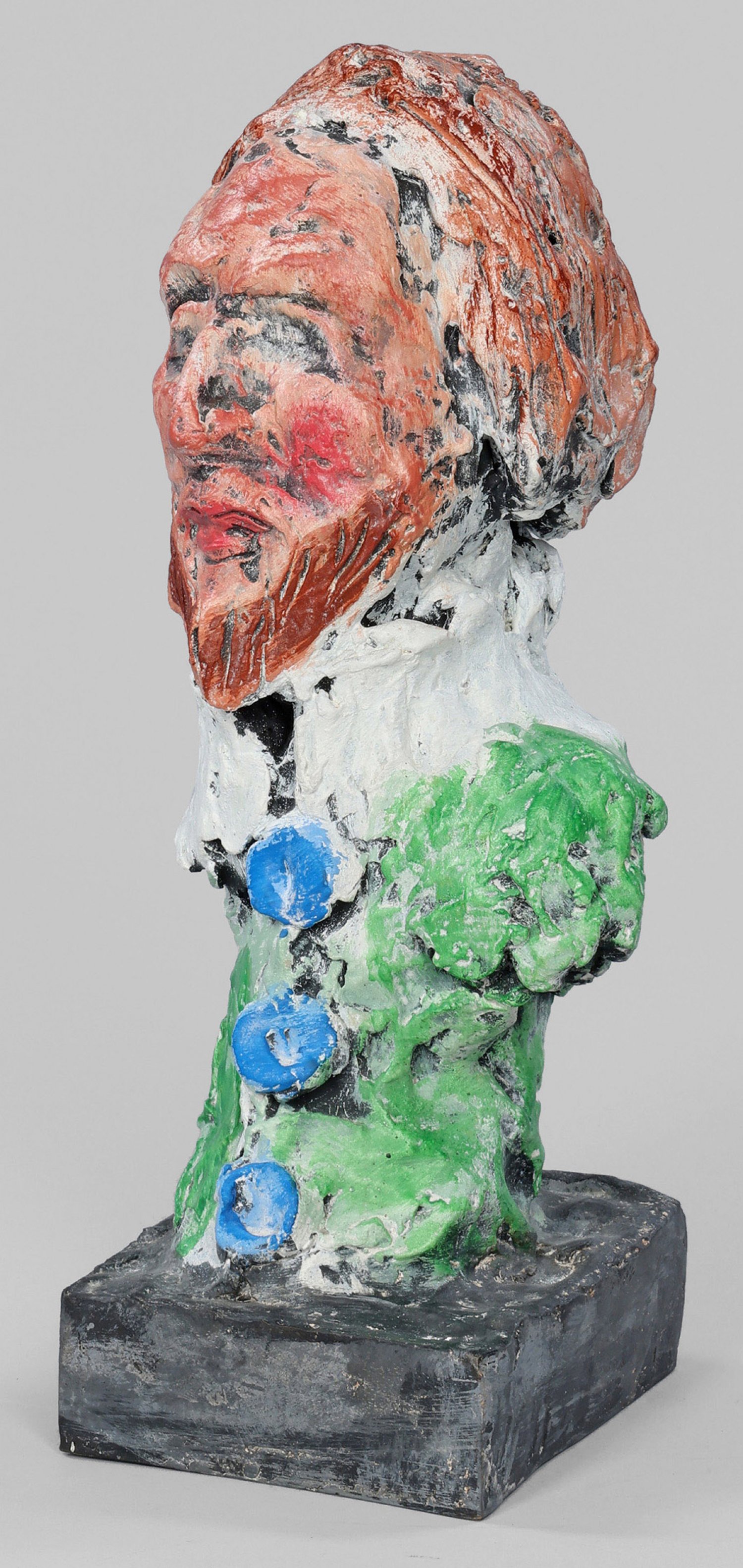 Bronze mit Handbemalung, 2015. Stempel-Sign. (Monogr) und Stempel der Kunstgießerei Schmäke, Düsseldorf, sowie "E. A.". Auflage 45 Exemplare + E.A.; Durch die individuelle Bemalung von Hand erhalten die Bronzen Unikatcharakter. Lüpertz setzte sich in dieser expressiven Büste, deren Ausdruck durch leuchtende Rot-, Grün- und Blautöne gesteigert wird, hier sein eigenes "Ich" sowohl in eine enge Beziehung zu der Persönlichkeit des Schriftstellers "Heinrich Mann" und der titelgebenden Figur "Henri Quatre" aus dessen beiden Romanen von 1935 und 1938. Der Künstler verschmilzt somit aber nicht nur die Identität der drei Persönlichkeiten, sondern auch drei Zeitebenen, Bildende Kunst, Literatur und Politik sowie historische Realität und Fiktion. Ca. 39 cm x 18 cm x 16 cm.