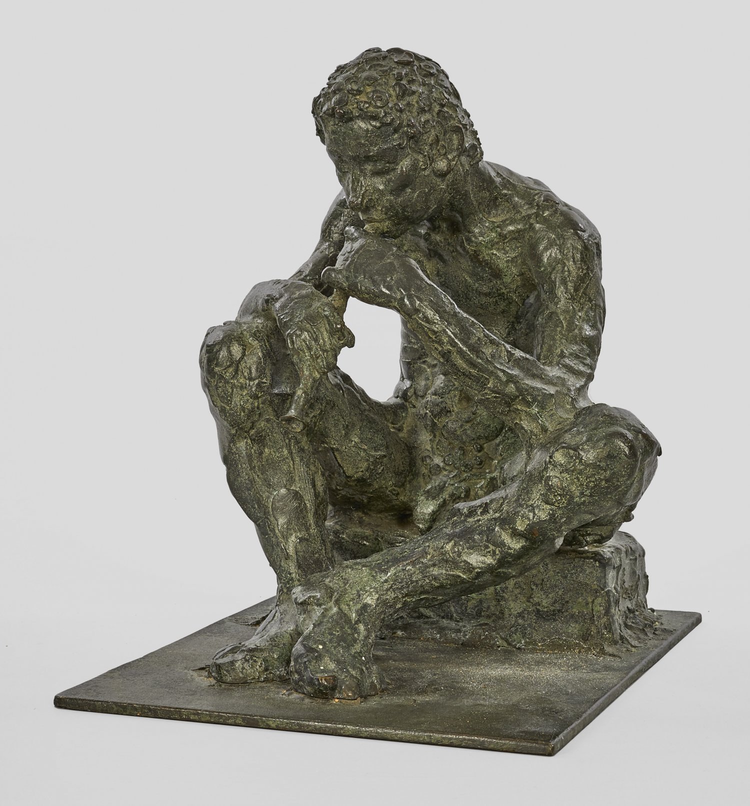 Bronze, dunkel patiniert.; Undeutl. sign.; Gießermarke. Sitzender, lebhaft modellierter Jünglingsakt. H. 36 cm.