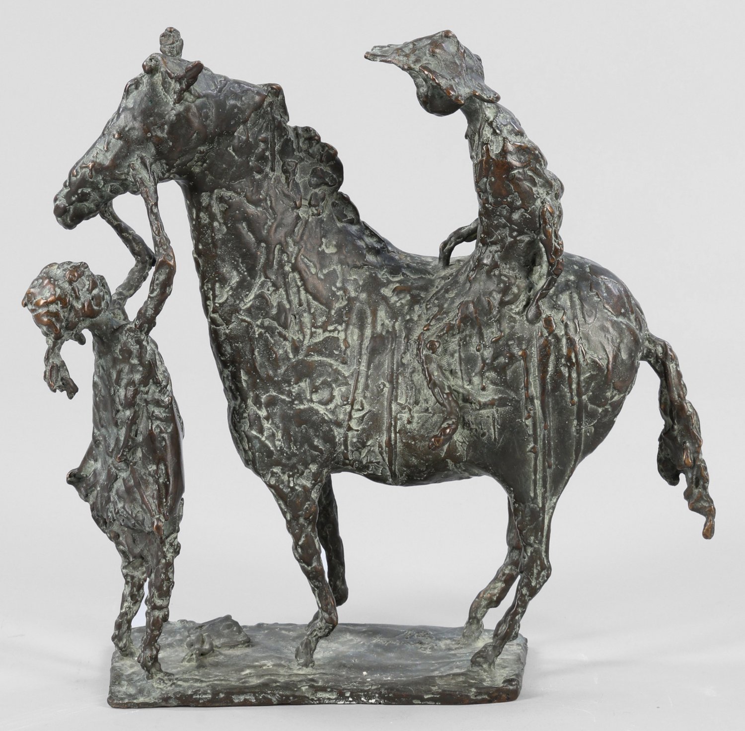 Bronze, dunkel patiniert, 2004. Sign. u. dat. (20)04. Auflage 12 Exemplare. Binding gehört zu den bedeutendsten figürlich arbeitenden Bildhauern der Gegenwart. Pferde und Reiter gehören zu seinen Lieblingssujets. Er absolvierte nach einer Steinmetz- und Bildhauerlehre an der Dombauhütte Köln 1959-1963 ein Studium der Bildhauerei an der Kunstakademie Düsseldorf. 1965-1975 wirkte er als Assistent bei Elmar Hillebrand an der Fakultät für Architektur der RWTH Aachen, 1976-1993 als Professor für Bildhauerei in Aachen. H. 33,5 cm.