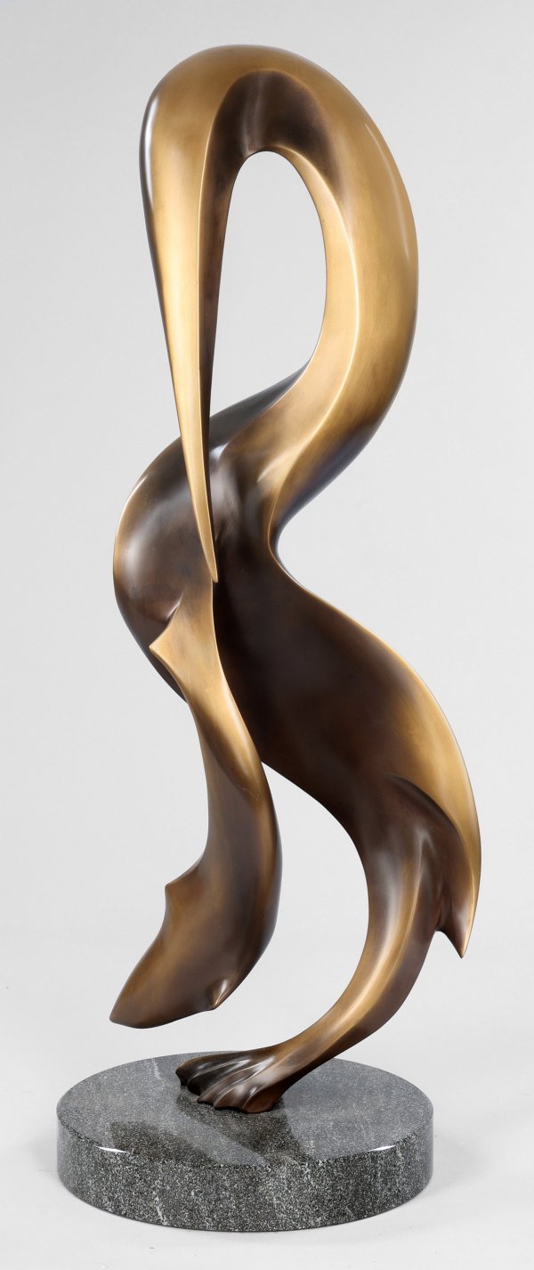 Bronze, dunkelbraun patiniert und poliert, 2013. Nummeriert 9/49. Guss Edition Strassacker, Süßen. Granitplinthe. In moderner Weise stilisierte Darstellung eines Pelikans beim Fangen eines Fisches. Simons elegante, glänzend schimmernde, vielansichtige Bronzeplastiken zeichnen sich durch fließende und harmonische Linienführung der reduzierten Formen aus, die im Wechselspiel zum Licht und Betrachter im Raum stehen. Der seit 1982 freischaffende Künstler absolvierte eine Lehre als Holz- und Steinbildhauer und bildete sich an der Bildhauerschule Geisler-Moroder in Österreich weiter, wo er heute selbst als Dozent tätig ist. Ges.-H. 89,5 cm.