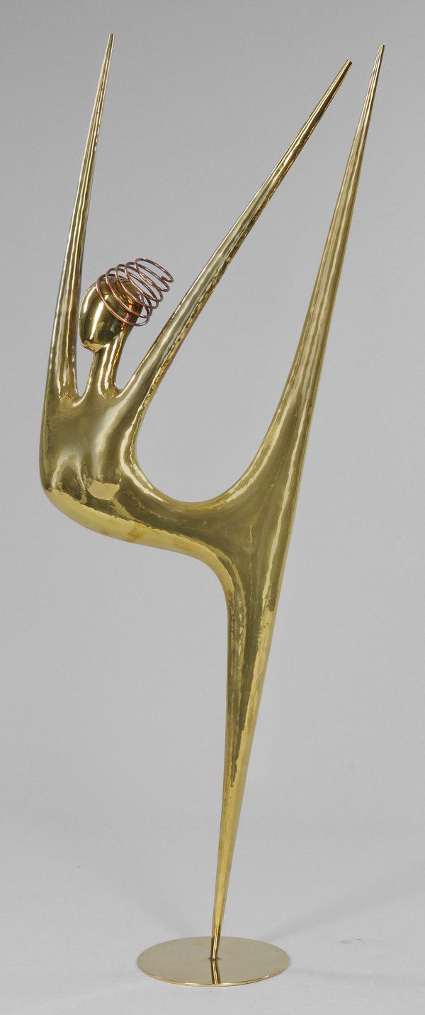 Messing, teilw. getrieben; Kupfer. Stempel "ATELIER SCHMIDT WIEN" und "MADE IN AUSTRIA". Unikat, 1987-2009. Auf einer runden Plinthe auf einem Bein stehende Tänzerin mit hoch erhobenen Armen und in der Pose korrespondierend hoch gestreckten anderem Bein, der Kopf mit spiralartigem Haar. Die stilisierte, silhouettenhafte, sachliche Figur im Stil der 1920er Jahre steht in der Tradition von Prof. Franz Hagenauer (1906 - 1986), bei dem Schmidt in dessen Meisterwerkstätte in Wien 1962-1965 lernte. 1969 wurde Schmidt Gürtlermeister und wirkte bis 1987 als Werkstättenleiter, Atelierassistent und Geschäftsführer in der Fa. Hagenauer. 1987 gründete Schmidt ein eigenes Atelier in Wien-Mariahilf, 2009 verlegte er es nach Neudorf. H. 97,5 cm.