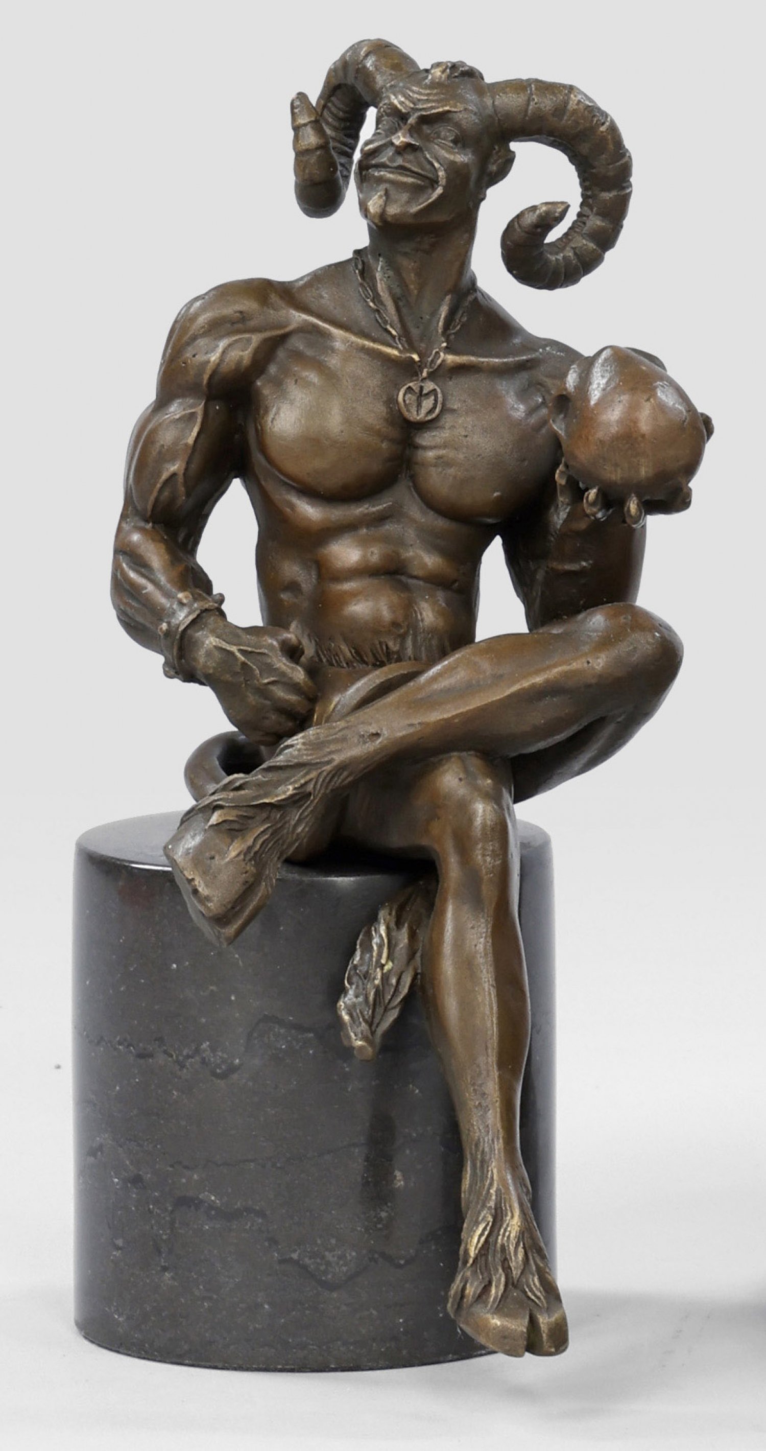Bronze, dunkelbraun patiniert. Sign.; Dunkelgrauer Steinsockel. Der Bildhauer greift in der über die Existenz sinnierenden Teufelsfigur mit Widderhörnern, der in seiner linken Hand den Schädel hält, Shakespeares Hamlet-Motiv auf. Ges-H. 23,2 cm.
