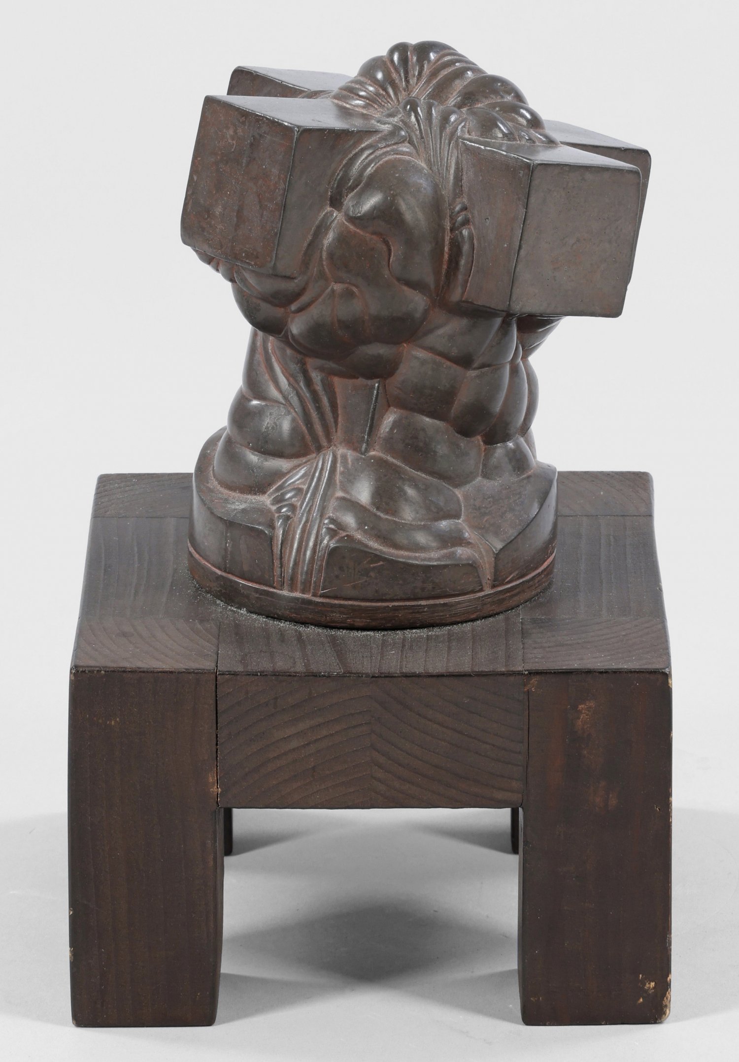 Metallguss, dunkelgrau patiniert, 1979. Sign. u. dat.; Tischartiger Sockel aus dunkelgrau gebeiztem Nadelholz. Ges.-H. 24 cm.