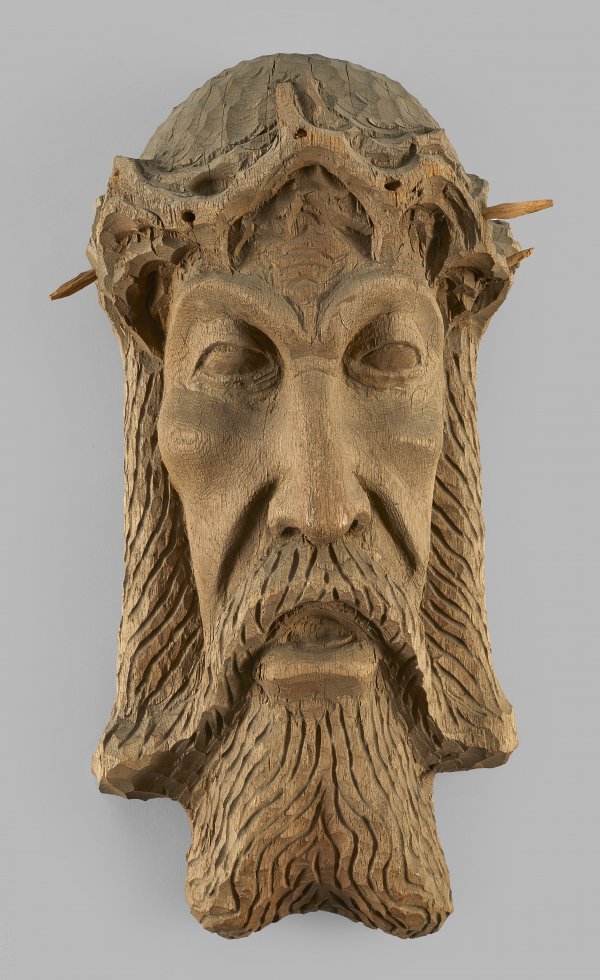 Eichenholz, geschnitzt, rücks. gehöhlt, dunkelbraun gebeizt. Verso wohl eigenhändig bez. mit Ortsangabe Lüneburg u. dat. 1947 (in Bleistift). Expressionistische Skulptur Utechs, der 1945-1952 in Lüneburg ansässig war. Zu den vergleichbaren Werken zählt die im Jahr zuvor entstandene, ebenfalls aus Eichenholz geschaffene "Bernhard Shaw-Maske", die sich seit 1998 im Lippischen Landesmuseum in Detmold befindet. Dornen besch. u. erg. bzw. verloren. H. 47,5 cm.