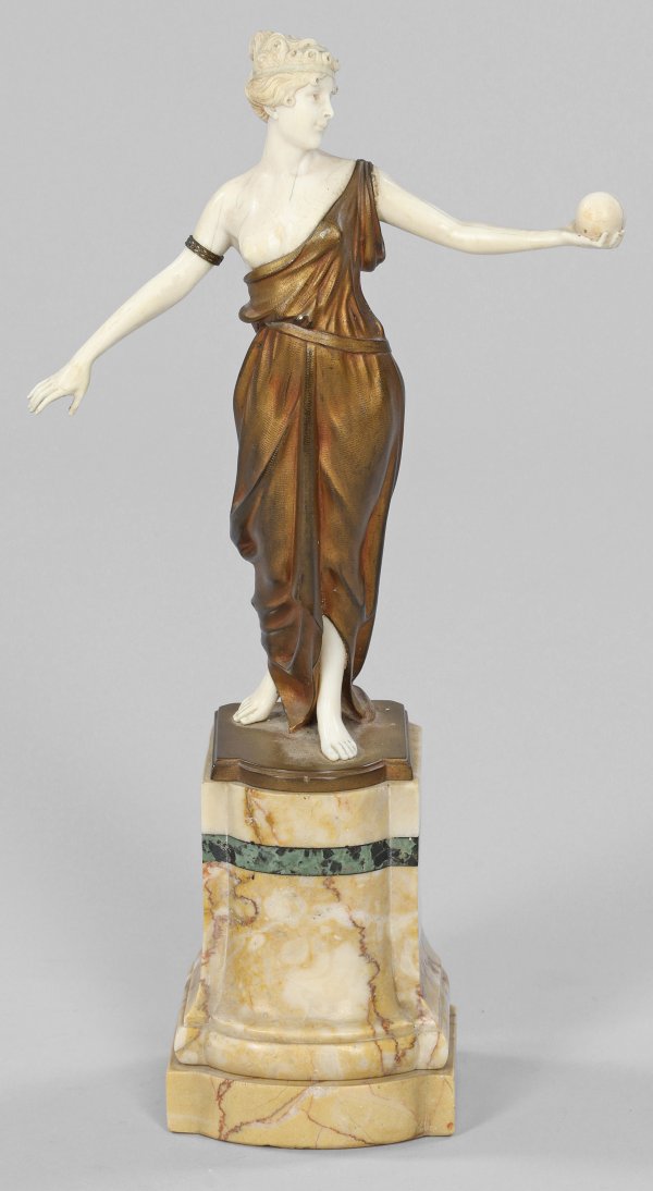 Elfenbein, geschnitzt; Bronze. Sign.; Postamentsockel aus hellem, creme- bzw. ockerfarbenem sowie dunkelgrünem Marmor. Auf einer flachen Plinthe schreitende junge Frau in langem, antikisierendem, die rechte Brustseite freilassendem Gewand, in der linken, erhobenen Hand eine Kugel haltend. Frühe, um 1900-1910 entstandene Chryselephantin-Statuette des Bildhauers, dessen Oeuvre vornehmlich Figuren des Jugendstils und Art Déco umfasst. Ges.-H. 32,2 cm.