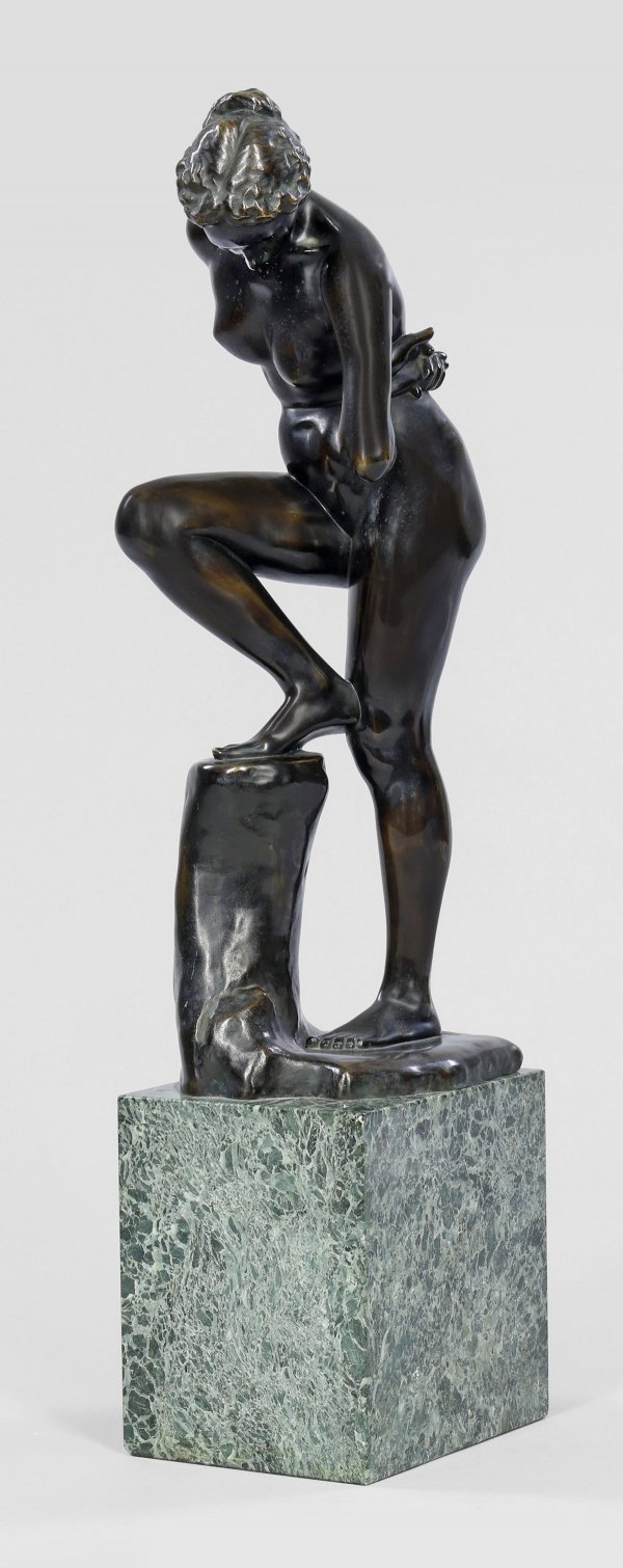Bronze, dunkelbraun patiniert, 1896/97. Gießerinschrift "Akt. Ges. v. H. Gladenbeck & Sohn". Guss nach 1902/03. Hoher grün-schwarzer Marmorsockel. Klinger schuf 1896/97 die mit 152 cm lebensgroße, teilw. vergoldete Marmorskulptur "Badendes Mädchen, sich im Wasser spiegelnd", die sich heute im Museum der Bildenden Künste in Leipzig befindet. Die "Badende" ist eine der reizvollsten Figuren seines bildhauerischen Oeuvres. Mit der Erlaubnis Klingers fertigte die Berliner Bildgießerei H. Gladenbeck & Sohn ab 1902/03 Bronze-Reproduktionen in mehreren Größen an, die von der Leipziger Firma C. B. Lorck vetrieben wurden. Die Auflagenhöhe ist unbekannt. H. 40 cm. Ges.-H. 54,3 cm.