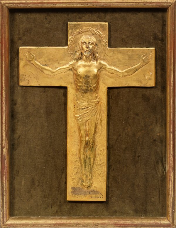 Bronze, vergoldet. Sig. "L. BISTOLFI" und Ligatur-Monogr. "LB". Das haptisch subtil gestaltete Relief schildert den gekreuzigten Christus in symmetrischer Weise auf breiten Kreuzbalken mit erhobenem Kopf und mandorlaartigem Dornenkranz. Es gehört zu den bekanntesten Werken Bistolfis, der als der bedeutendste italienische Bildhauer des Symbolismus gilt. 1901 vollendete Bistolfi das Modell für das Kruzifix, das danach in verschiedenen Bronze-, Marmor- und Gipsversionen ausgeführt wurde, u. a. für das Grab von Riccardo Brayda in Villarbasse, das Metzger-Dorna-Grabmal in Turin und das Mausoleum der Vittoriale degli Italiani in Gardone Riviera am Gardasee; Exemplare in Museumsbesitz befinden sich in der Galleria d'Arte Moderna-Nervi in Genua und im Palazzo Mazzetti in Asti. 43 cm x 33 cm. Rahmen.