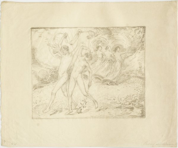 Lithographie/Papier. Im Stein monogr.; Künstler-Bez. u. Nummerierung 6/15. Um 1905 entstandenes Blatt des Malers und Grafikers, der Elemente des Symbolismus und Jugendstils verband und 1903-1916 als Professor in Weimar Wegbereiter der Moderne war. Zu seinen Bewunderern zählten Rainer Maria Rilke, Thomas Mann und Hugo von Hofmannsthal, der das Vorwort zu Hofmanns Grafikmappe "Tänze" (1905) schrieb. Blatt 40,5 cm x 51 cm.