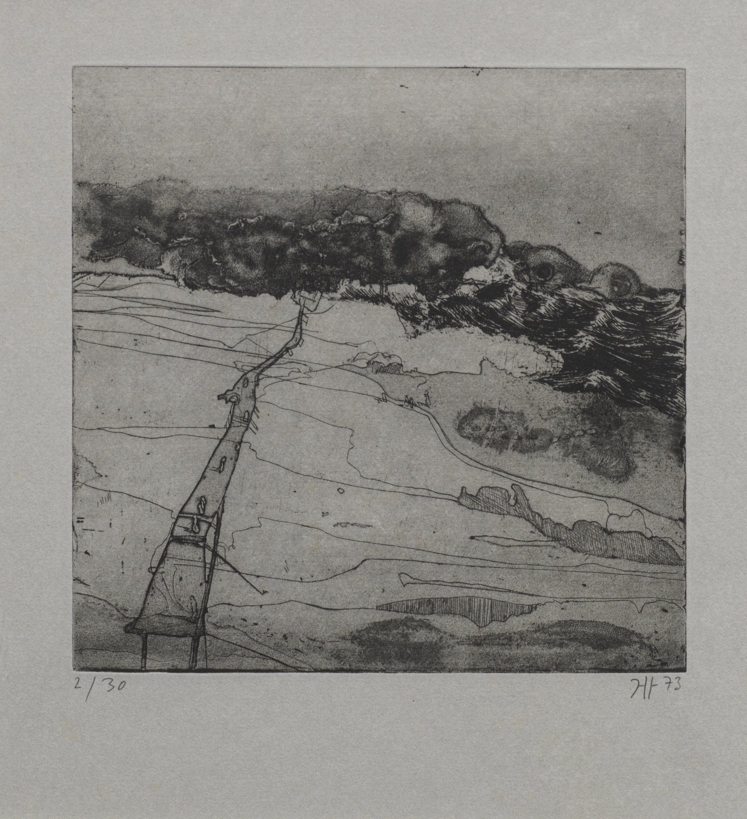 Radierung auf grauem Bütten, 1973. Sign., nummeriert 2/30 u. dat. (19)73. Aus der Propylaen-Mappe "Landschaften". Plattenmaß 19,7 cm x 19,5 cm; Blatt 39,8 cm x 28,8 cm (Passepartoutausschnitt).