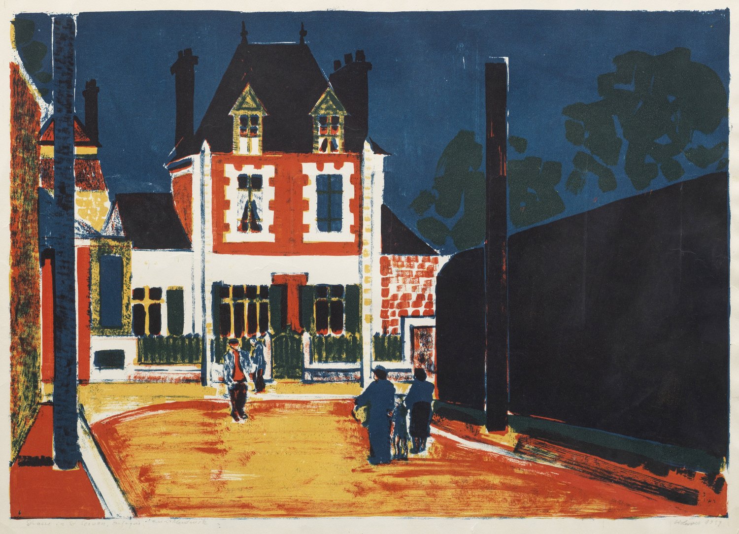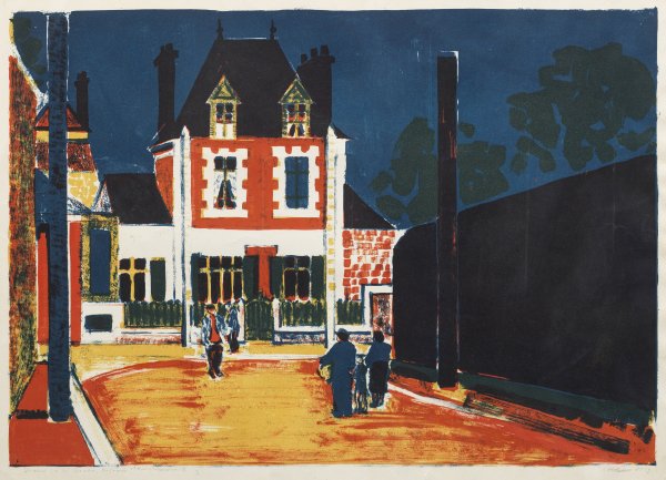 Farblithographie/Papier, 1959. Sign. u. dat., betitelt sowie bez. "Handdruck". Lagerspuren mit minim. Läsuren bzw. ger. Knickfalten im Blattrand. Darstellung ca. 44,2 cm x 63 cm; Blatt 53,5 cm x 68,5 cm. Rahmen.