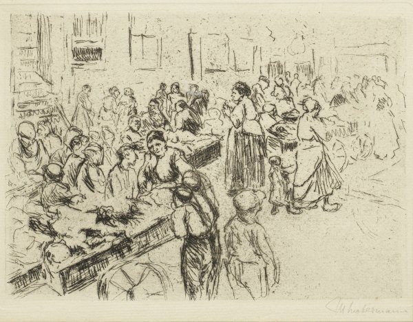 Kaltnadelradierung/Papier, 1908. Sign.; Hrsg. Paul Cassirer, Berlin. Wvz. Schiefler 73. Liebermann entdeckte 1876 in Amsterdam eines seiner großen Themen: das faszinierende Treiben im Judenviertel - eine eigene Welt mit eigenem Rhythmus und eigenen Gesetzen des Zusammenlebens. Insbesondere 1905-1909 kehrte er immer wieder dorthin zurück, um in großer Unmittelbarkeit die Studien für zahlreiche Grafiken und Gemälde anzulegen. Plattenmaß 14,8 cm x 19,5 cm. Rahmen.