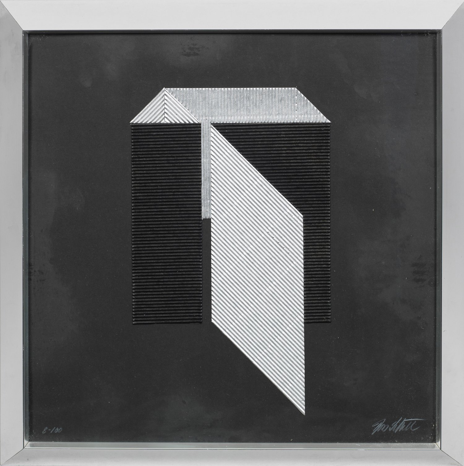 Collage with silver and black corrugated cardboard on dark grey cardboard. Signed and numbered "8 - 100". Published by Ørskov & Co., Copenhagen. Label of the publisher on the reverse.