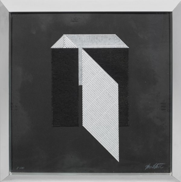 Collagierter, silberfarbener und schwarzer, dünner Wellkarton auf anthrazitfarbenem Karton. Sign. u. nummeriert "8-100". Hrsg. Ørskov & Co., Kopenhagen. Verso Etikett von Ørskov mit Angaben zu Littell und zur Auflage. Seltene Grafik des bedeutenden Möbel- und Textildesigners, der durch seine funktionalistischen und minimalistischen Entwürfe bekannt wurde und u. a. im Metropolitan Museum of Art und Museum of Modern Art vertreten ist. 41,5 cm x 41,5 cm. Rahmen.