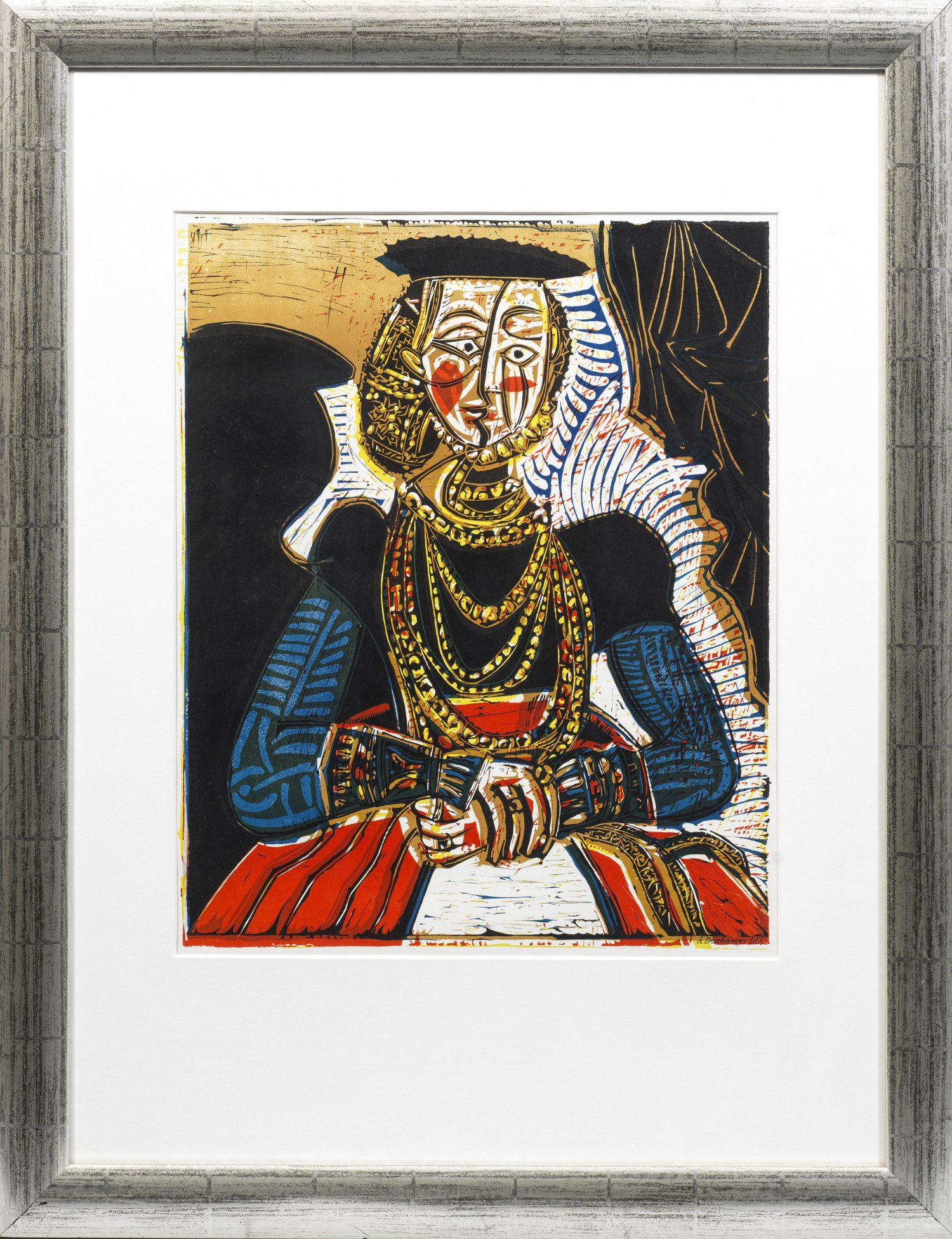 Farblithographie/Papier, 1966. R. u. im Stein sign. "h. Dechamps lith.". Autorisierte, von Mourlot in Paris gedruckte Grafik von Henri Deschamps für die Ausstellung "Picasso. 86 gravures" in der Galerie Berggruen in Paris, nach dem gleichnamigen Picasso-Linolschnitt (1958). Wvz. Czwiklitzer 228. Darstellung ca. 55 x 45,5 cm. Rahmen.