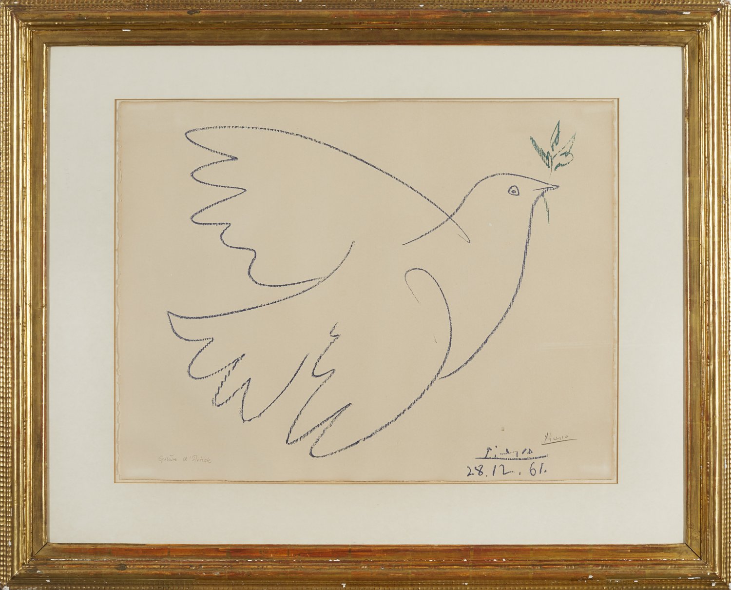 Farblithographie oder Farb-Fotolithographie/Velin, 1961. Sign. in Bleistift, bez. "Epreuve d'Artiste". Mit der reproduzierten Signatur und der Datierung im Druckträger bzw. Stein. "E.-A."-Abzug außerhalb der signierten und nummerierten Auflage von 200. Die Darstellung des Blattes wurde später für den oberen Teil des berühmten Plakates für den "Congrès National du Mouvement de la Paix 10 et 11 May 1962 Issy-les-Moulineux" verwendet, außerdem für ein Ausstellungsplakat der Galerie de la Colombe, Vallauris (1962), vgl. Czwicklitzer, Wvz. der Plakate 179/179 bis. Leicht gebräunt. Darstellung ca. 44 cm x 53 cm; Blatt ca. 49,5 cm x 66 cm. Rahmen.