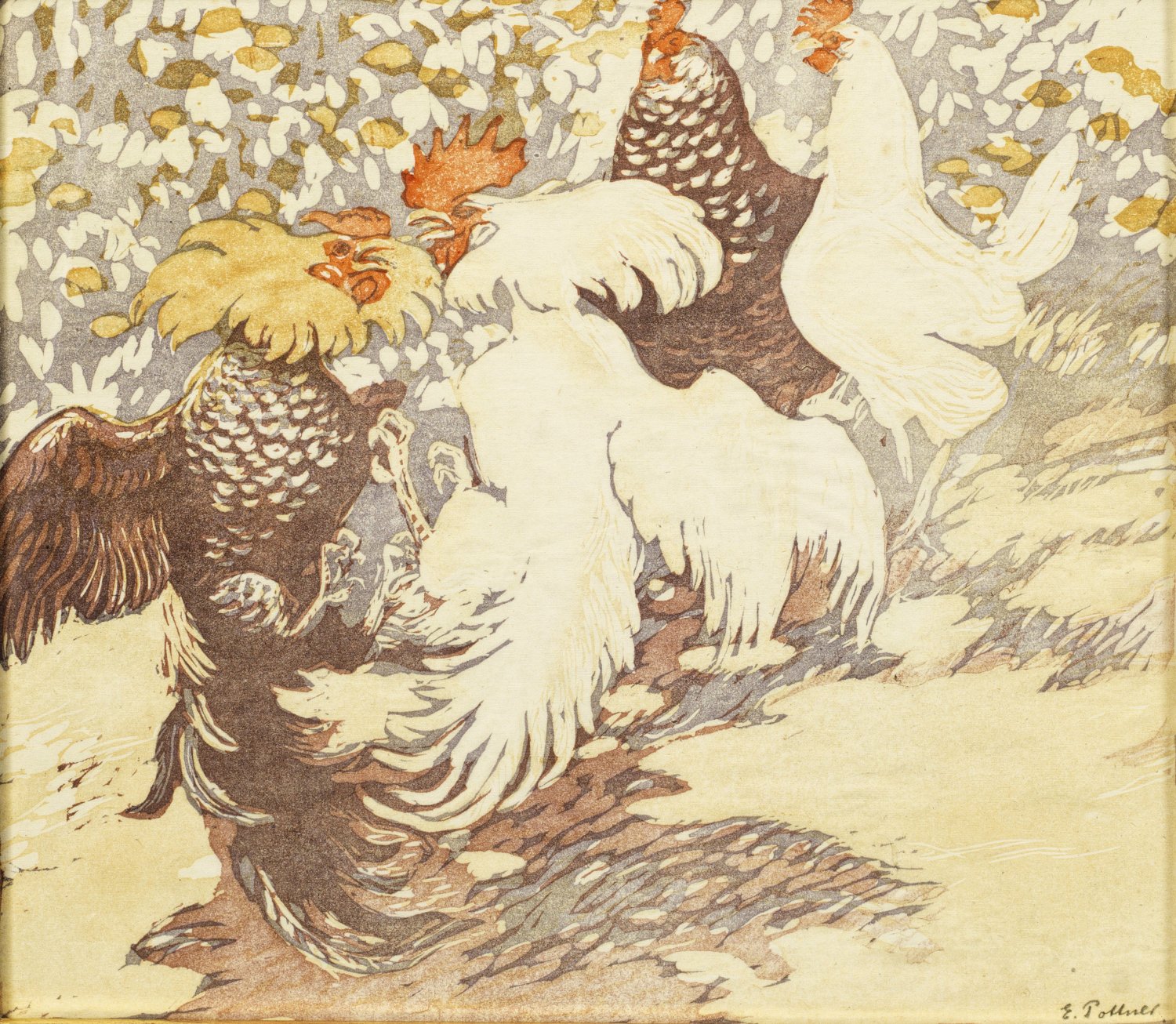 Farbholzschnitt/Papier. R. u. sign.; Motiv- und stiltypisches Blatt des jüdischen Malers, Grafikers und Keramikers, der mit Vorliebe Vögel darstellte. Pottner wurde 1913 in den Vorstand der Berliner Secession gewählt. 1912-1924 erschienen mehrere Portfolios mit Lithographien und Farbholzschnitten sowie selbst verfasste Bücher Pottners mit eigenen Illustrationen. Ca. 31 cm x 35 cm. Rahmen.
