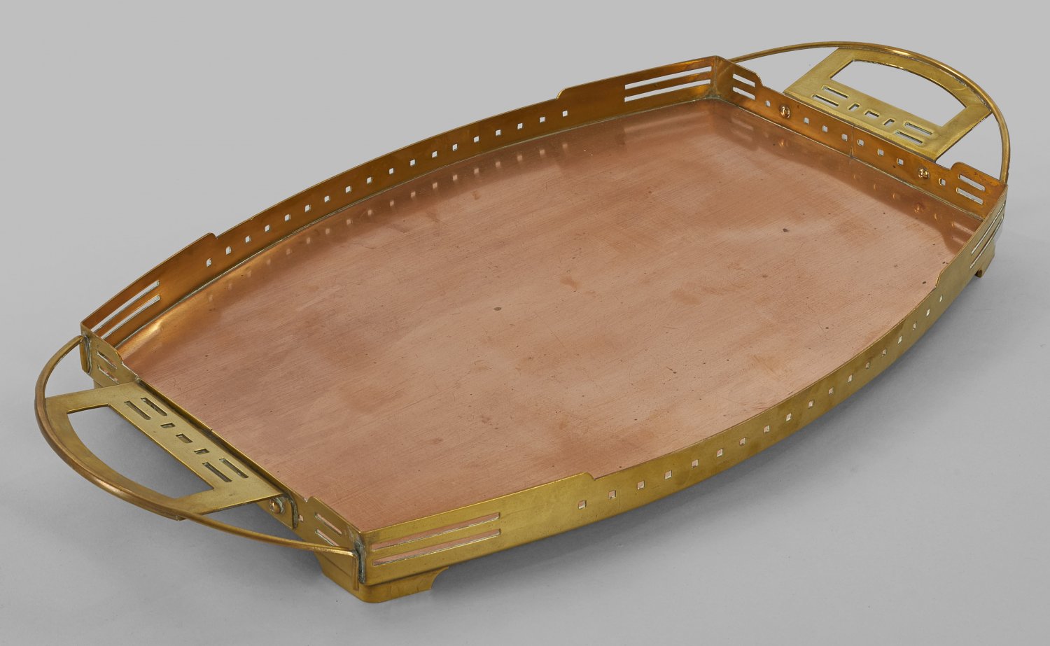 Jugendstil-Tablett von Gustave Serrurier-Bovy Messing und Kupfer. Rechteckige, an den Längsseiten gerundete, glatte Fläche mit durchbrochen gearbeiteter und von kleinen Quadraten und Längsstreifen akzentuierter Galerierahmung auf niedrigen Füßen. Seitlich leicht schräggestellte, runde Handhaben mit korrespondierendem Dekor. Entw. Gustave Serrurier-Bovy. H. 6,5 cm. 60 cm x 31,5 cm.