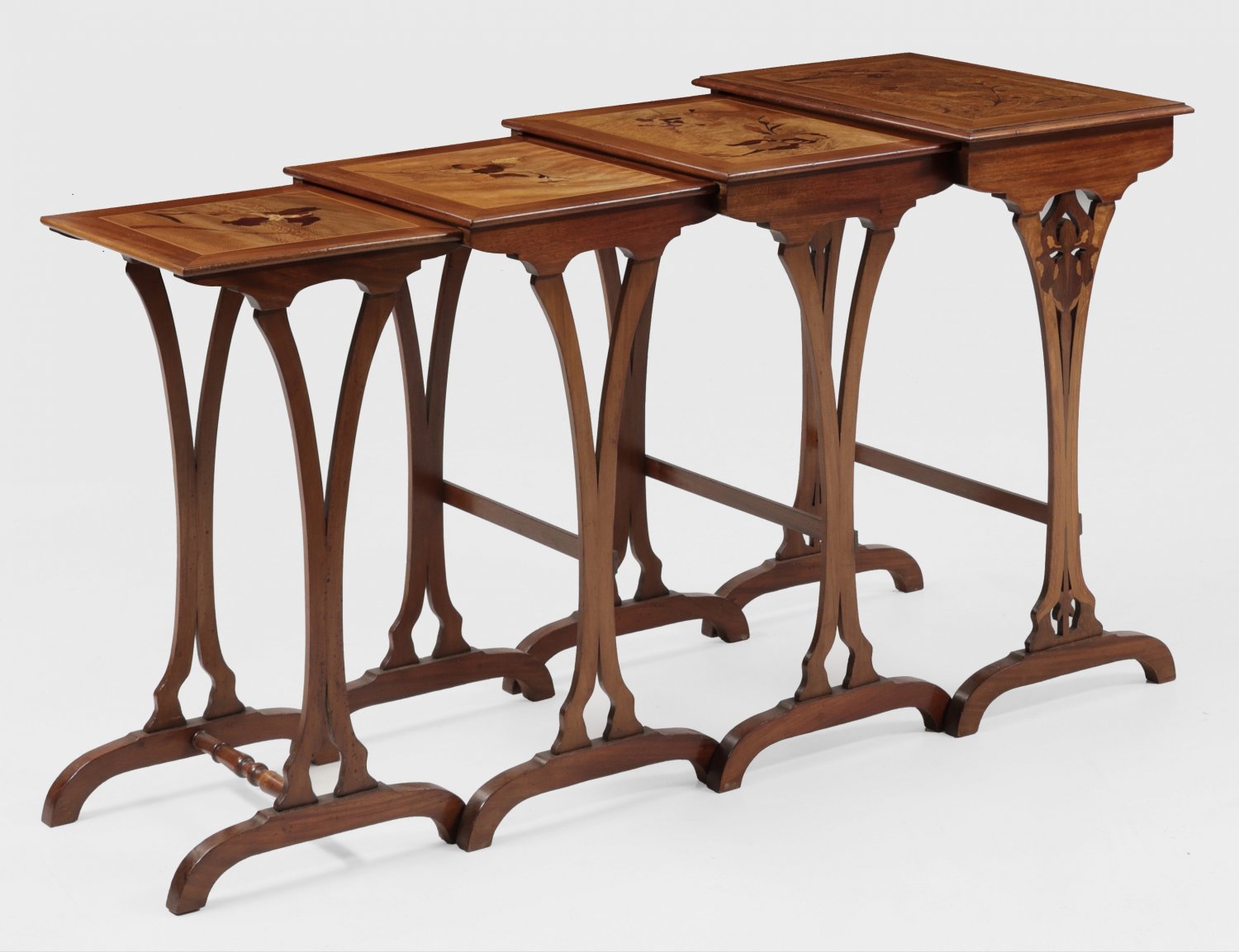 Jugendstil-Satztisch von Emile Gallé 4-tlg.; Mahagoni, massiv und furniert sowie aufwändige Marketerie aus unterschiedlichen teilw. gefärbten Edelhölzern wie Wurzelnuss, Rüster, Ahorn und Platanenholz sowie Palisander und Rosenholz. Schmale Seitenwangen aus schlanken Streben auf flachgewölbten Kufen als Träger für rechteckige Deckplatten. Unterschiedliche Marketerie aus Schwertlilien, Wicken, Nelken und Brombeerzweig. Bez. Gallé. H. 68 cm. 74 cm. 36 cm x 36 cm - 56 cm x 38,5 cm.