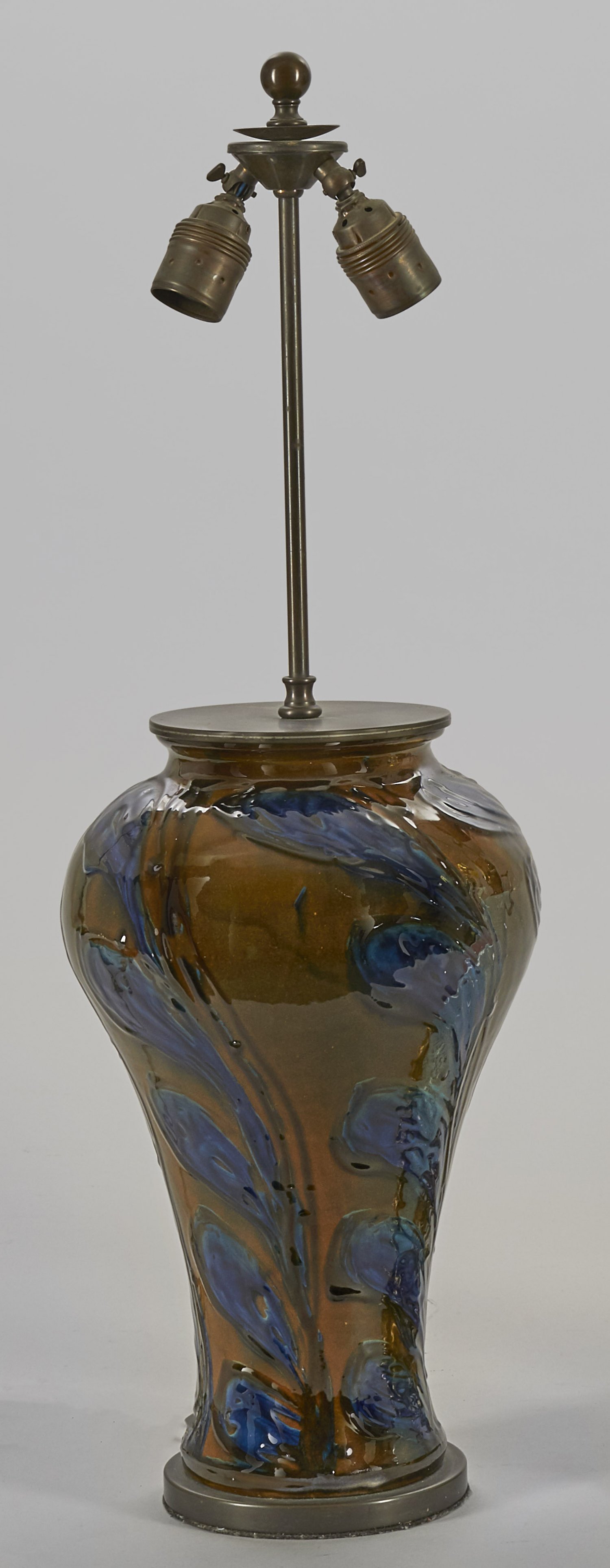 Lampenfuß von Kähler 2-flg.; Irdenware. Balusterform. Stilisierter, floraler Schlickerdekor in Blau auf braunem Grund. Messingmontierung. Verkabelung mit Schalter und Stecker erneuert. Ges.-H. 72 cm.