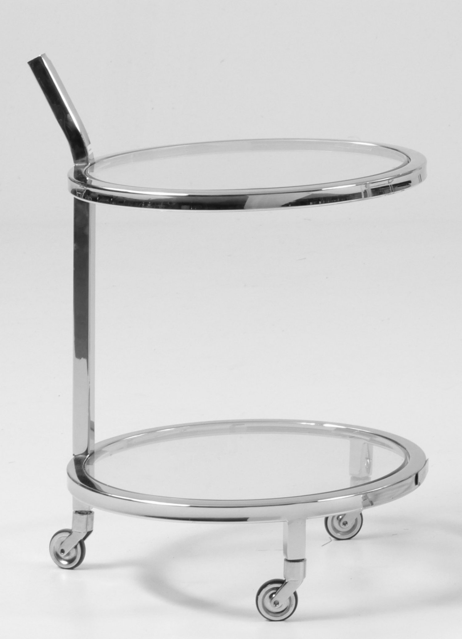 Kleiner Barwagen Metall, vernickelt sowie farbloses Glas. Gestell aus gekantetem, teilw. gebogtem Schaft als Träger für runde Abstellflächen. Unterhalb kurze, gekantete Beine auf Rollen. H. 72 cm. D. 50 cm.