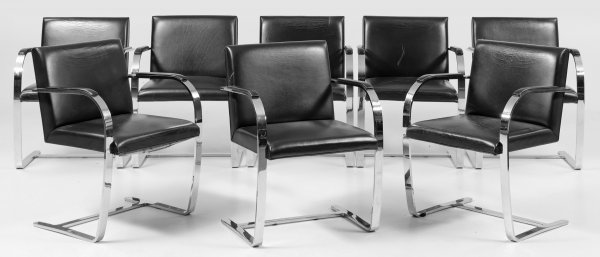 A set of eight chromed steel and leather Knoll Brno chairs designed by Mies van der Rohe. Signs of use.