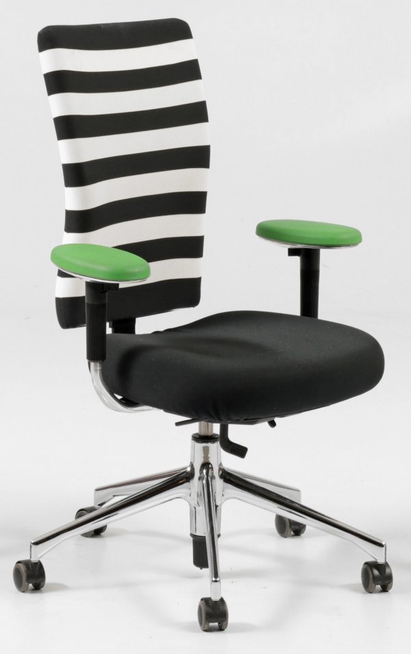 Bürostuhl "T-Chair" von Antonio Citterio Aluminium und Metall, schwarz lackiert, leuchtend grüner bzw. schwarzer Kunststoff sowie schwarzer und schwarz-weiß gestreifter Stoff. Über sternförmigem Fuß mit Rollen höhenverstellbarer Schaft als Träger für gerundete Sitzfläche. Gebogte Stütze für ellipsenförmige, drehbare Armlehnen sowie fixierbare Rückenlehne. Herstellerzeichen. Entw. Antonio Citterio. Sitz-H. 40 - 50 cm.