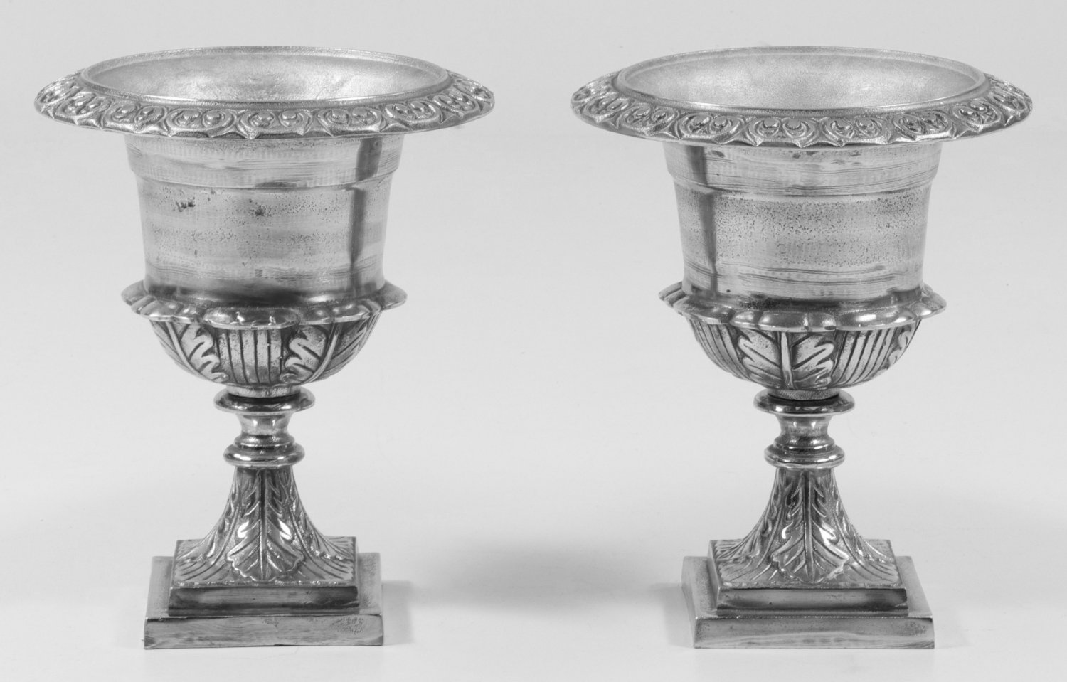 Paar dekorative Kratervasen Metall. Balusterförmiger Korpus, umlaufend mit breitem Blattfries sowie weit ausschwingendem Lippenrand aus Volutenspangen. Unterhalb gestuft ansteigender Sockel. H. 52 cm. D. 45 cm.