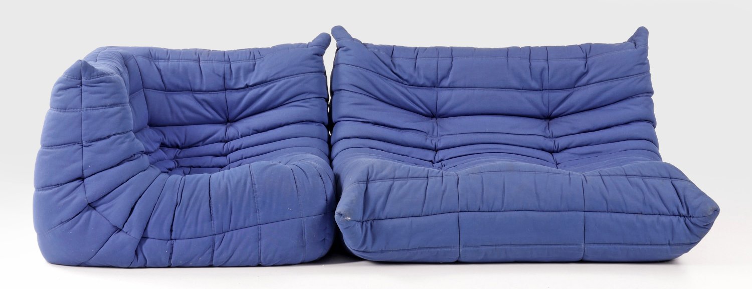 Loungesofa "Togo" von Michel Ducaroy 2-tlg.; Breite, organisch geformte, kissenartige Sitzfläche sowie niedrige Rücken- bzw. Armlehne. Allseitig blauer, abgesteppter Stoffbezug. Herstellerzeichen. Entw. Michel Ducaroy, 1973. Gebrauchsspuren. H. 67 cm. 220 cm x 95 cm. Sitz-H. 30 cm.