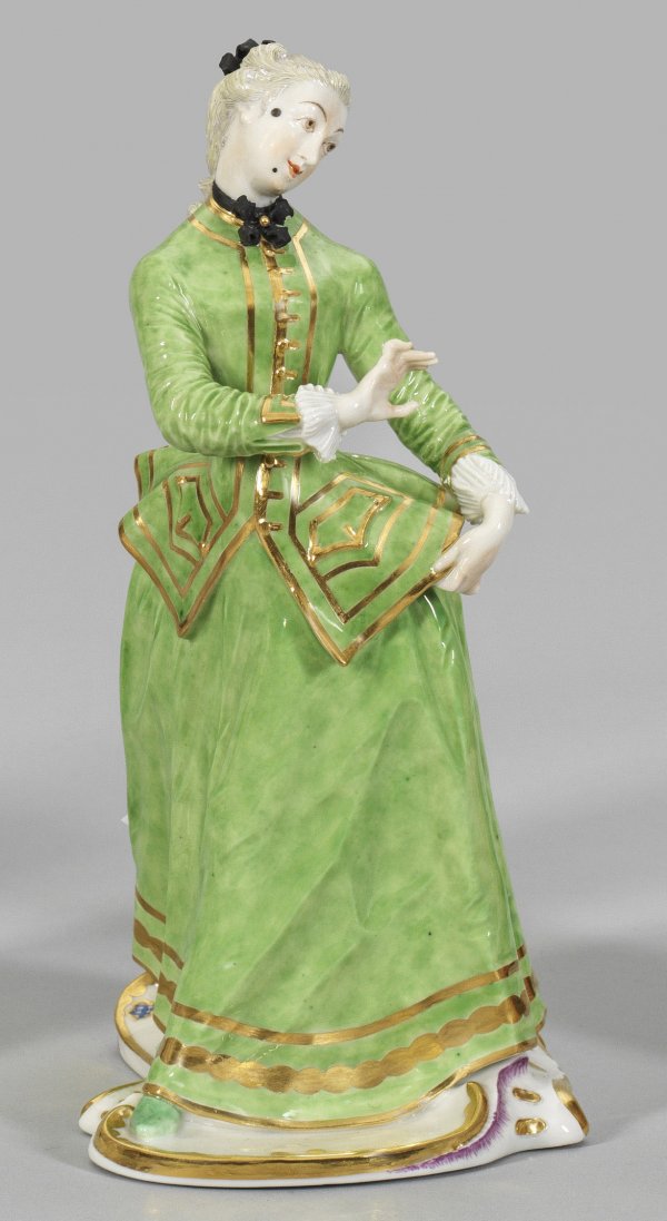 "Julia" aus der Italienischen Komödie Auf geschweiftem Rocaillesockel, sich zur Seite wendende Julia in grüner Jacke über langem, gleichfarbigem Rock. Das gepuderte Haar zum Zopf zusammengefasst. Polychrome Malerei mit Goldstaffage. Entw. Franz Anton Bustelli, 1759/60. Manufakturmarke. H. 21 cm.