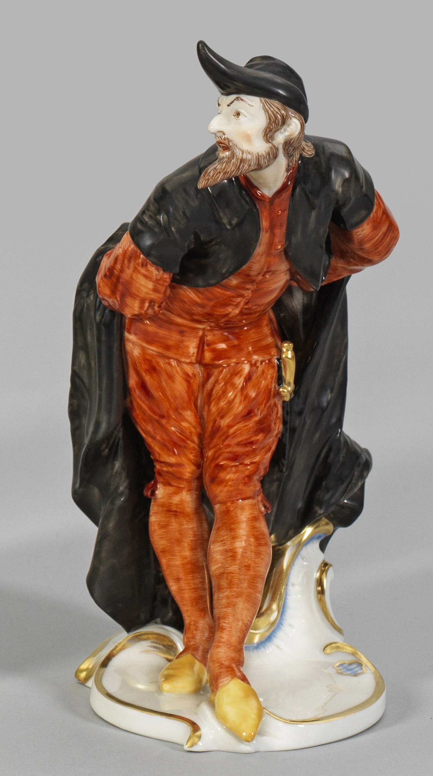 "Pantalone" aus der Italienischen Komödie Auf Rocaillesockel stehender Pantalone in rotem Kostüm mit schwarzem Mantelumhang. Polychrome Malerei mit Goldstaffage. Entw. Franz Anton Bustelli, 1759/60. Manufakturmarke. H. 18 cm.
