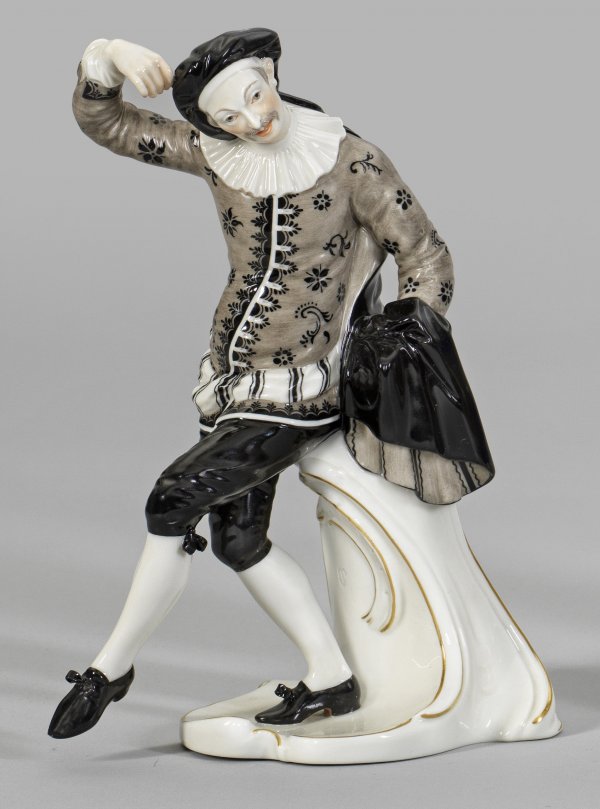 "Scaramuz" aus der Italienischen Komödie Auf Rocaillesockel, in Tanzschritt stehender Komödiant in blumig gemustertem, grauem Wams und schwarzer Hose, seinen Umhang im linken Arm haltend. Polychrome Malerei mit Goldstaffage. Entw. Franz Anton Bustelli, 1759/60. Manufakturmarke. H. 19,5 cm.