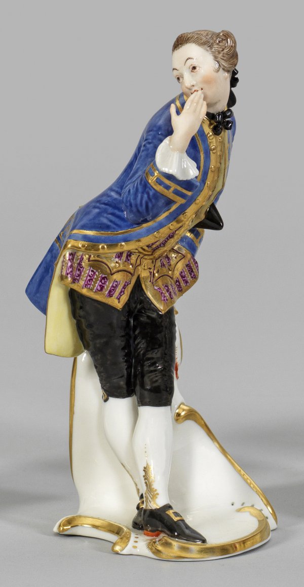 "Octavio" aus der Italienischen Komödie Auf Rocaillesockel stehender Octavio in blauer, goldbetresster Jacke und schwarzer Kniebundhose. Polychrome Malerei mit Goldstaffage. Entw. Franz Anton Bustelli, 1759/60. Manufakturmarke. H. 19 cm.