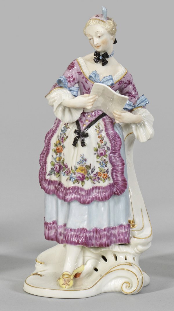 "Corine" aus der Italienischen Komödie Auf Rocaillesockel stehende Dame in hellblauem Rock, blumig gemustertem Mieder und Schürze, einen Brief in den Händen haltend. Polychrome Malerei mit Goldstaffage. Entw. Franz Anton Bustelli, 1759/60. Manufakturmarke. H. 19,5 cm.