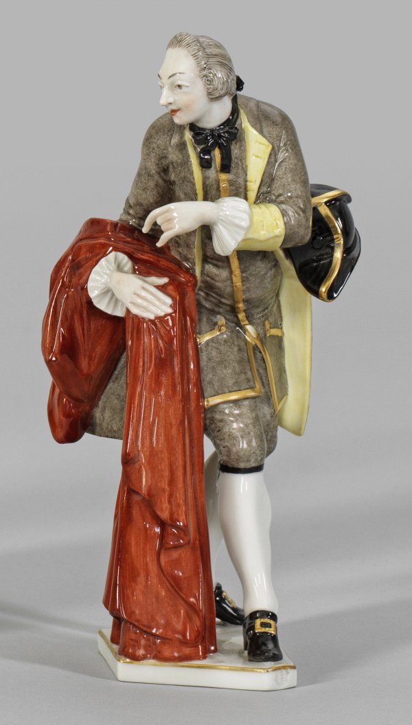 Kammerdiener Auf sechseckiger Plinthe stehender Herr in graufarbenem Anzug mit Dreispitz, in der rechten Hand einen roten Mantel haltend. Polychrome Malerei mit Goldkonturierung. Entw. Franz Anton Bustelli. Eingepresste Manufakturmarke. H. 17 cm.