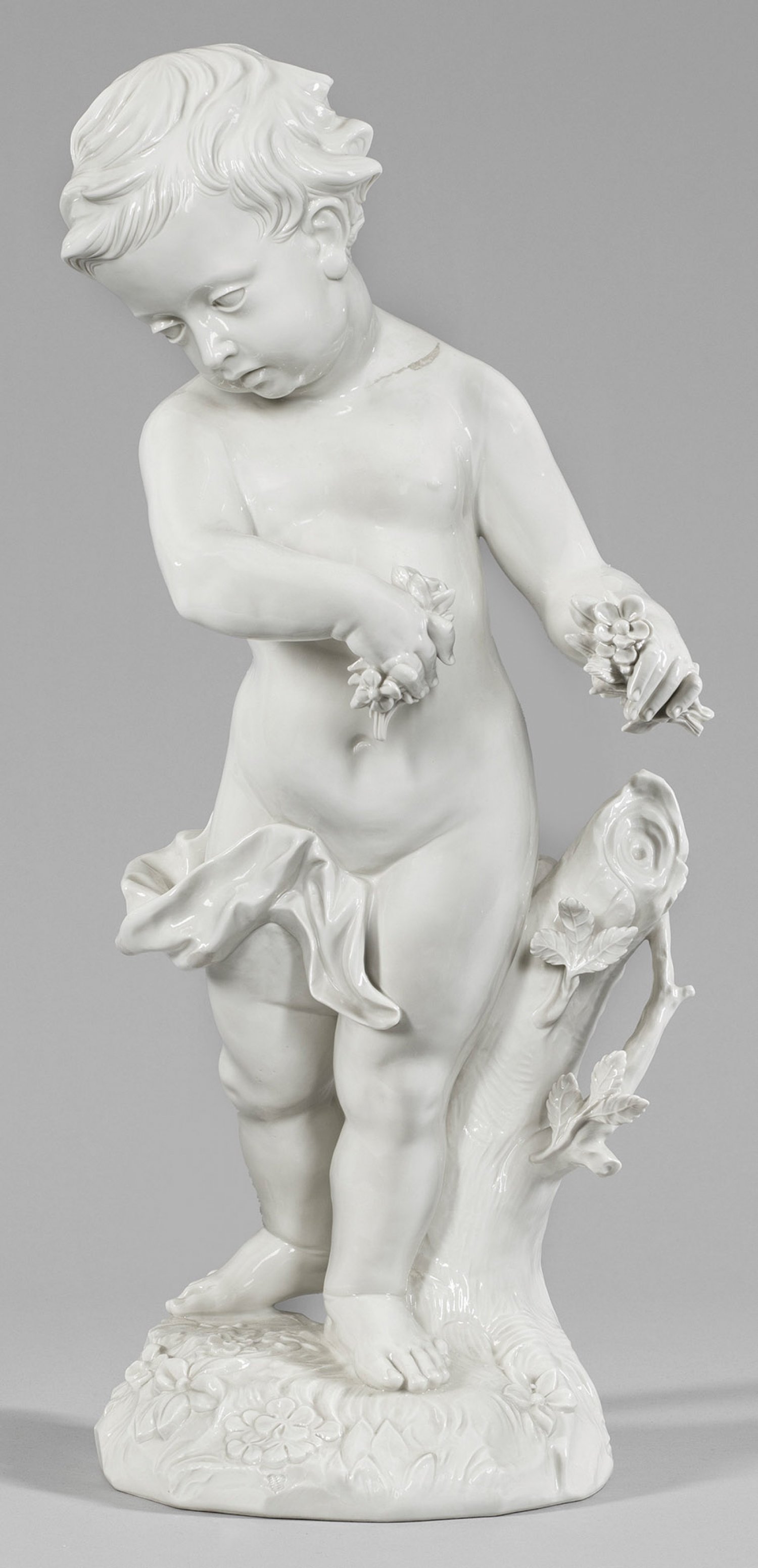 Große Figur "Putto als Frühling". Originaltitel aus der Serie "Vier Jahreszeiten". Weißporzellan. Auf naturalistisch gestaltetem, mit Blüten reliefiertem Sockel, gelehnt an einen Baumstamm stehender Putto mit nach unten gewandtem Kopf, in den Händen Blumensträuße haltend als Allegorie des Frühlings. Modell-Nr. 838. Entw. August Göhring (1891 - 1965), 1938. Entw.-Bez.; Minim. best.; Glasurfehler. Manufakturmarke. H. 71 cm.