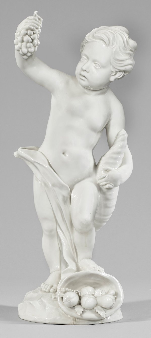 Große Figur "Putto als Herbst". Originaltitel aus der Serie "Vier Jahreszeiten". Weißporzellan. Auf naturalistisch gestaltetem Sockel, auf einem Füllhorn mit Früchten stehender Putto, in der erhobenen, rechten Hand einen Bund Trauben haltend, als Allegorie des Herbstes. Modell-Nr. 840. Entw. August Göhring (1891 - 1965), 1938. Entw.-Bez.; Teilw. verfüllte Brandrisse. Manufakturmarke. H. 72 cm.