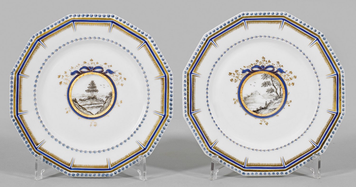Paar Ansichtenteller aus dem sog. Bayerischen Königsservice Zwölfeckige Form mit reliefiertem Perlfries. Im leicht vertieften Spiegel medaillongerahmte Landschaft in Grisaillemalerei. Blau-goldener Randdekor. Manufakturmarke. D. 21 cm.