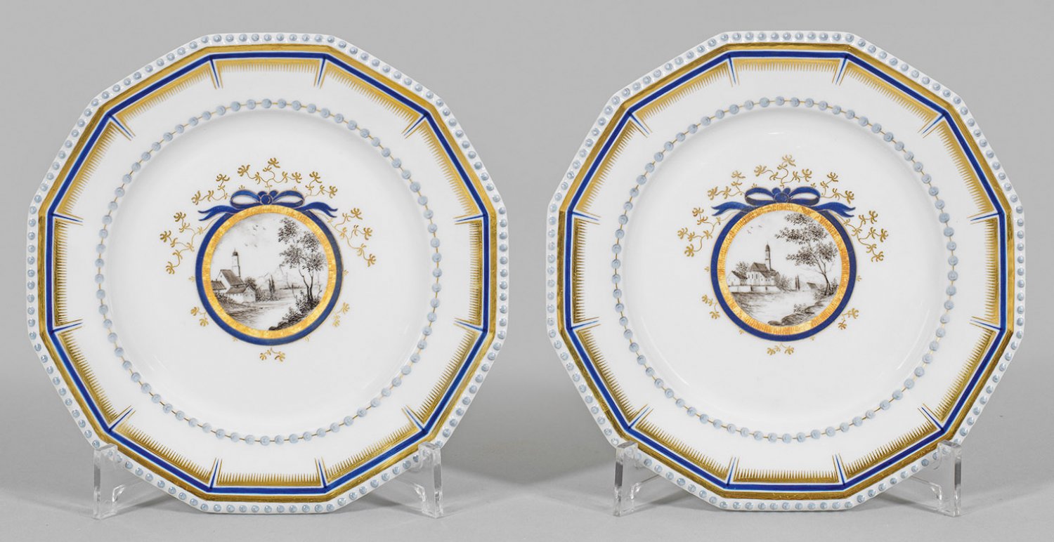 Paar Ansichtenteller aus dem sog. Bayerischen Königsservice Zwölfeckige Form mit reliefiertem Perlfries. Im leicht vertieften Spiegel medaillongerahmte Architekturlandschaft von Schwabing und Neuhausen in Grisaillemalerei. Blau-goldener Randdekor. Manufakturmarke. D. 21 cm.