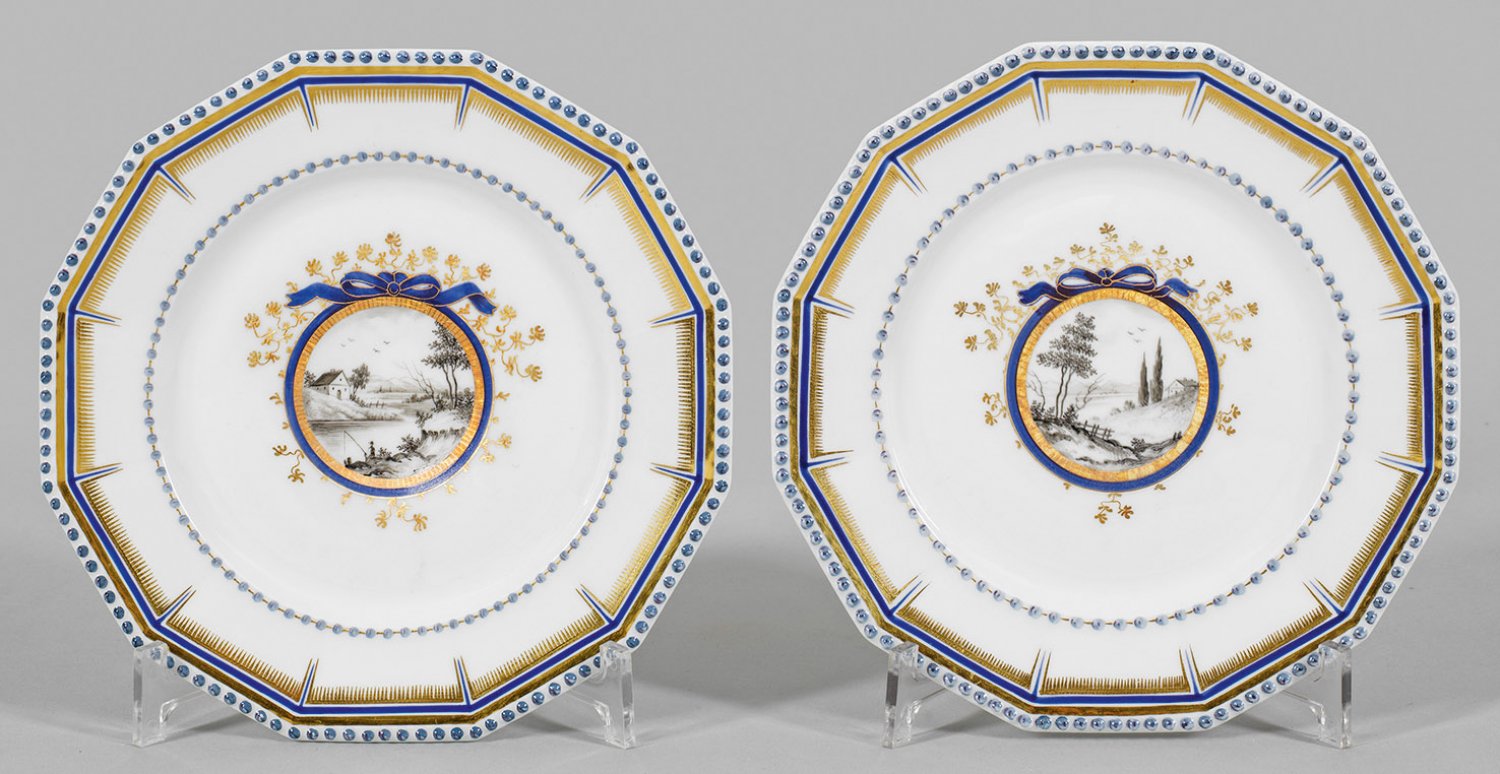 Paar Ansichtenteller aus dem sog. Bayerischen Königsservice Zwölfeckige Form mit reliefiertem Perlfries. Im leicht vertieften Spiegel medaillongerahmte Landschaft in Grisaillemalerei. Blau-goldener Randdekor. Manufakturmarke. D. 21 cm.