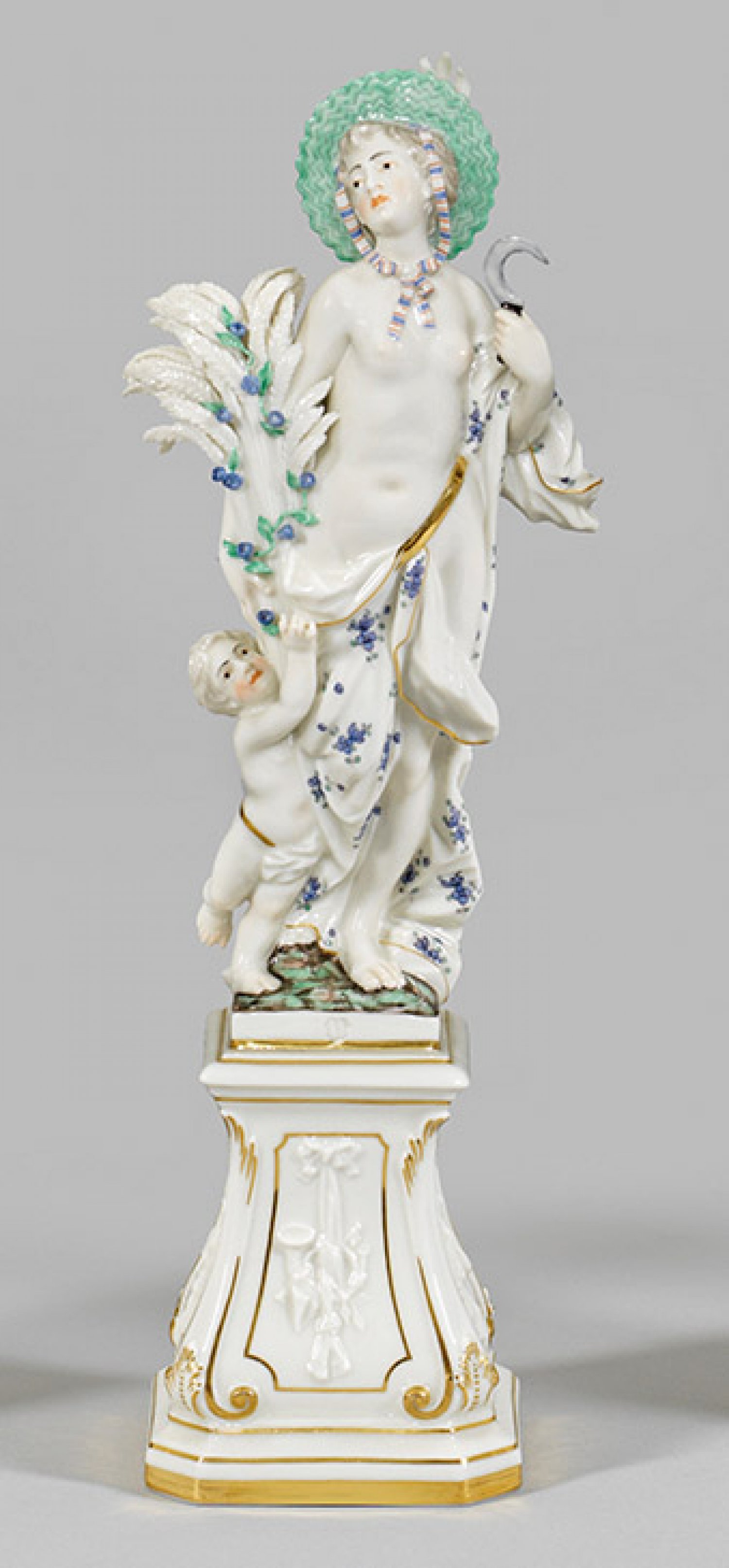 Allegorische Figur "Der Sommer" aus der Serie "Jahreszeiten" nach Alt-Frankenthaler Modell. Auf volutenförmig geschweiftem, profiliertem Podestsockel mit Symbolen der Musik stehende Dame mit Ährenbündel und Sichel. Seitlich stehender Putto. Polychrome Malerei mit Goldkonturierung. Entw. Konrad Link. Manufakturmarke. H. 28,5 cm.