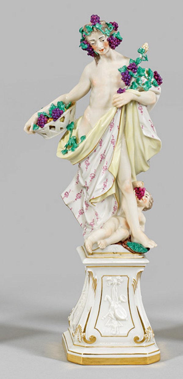 Allegorische Figur "Der Herbst" aus der Serie "Jahreszeiten" nach Alt-Frankenthaler Modell. Auf volutenförmig geschweiftem, profiliertem Podestsockel mit Symbolen der Musik stehender junger Mann, behangen mit Weinreben, in der rechten Hand einen Früchtekorb haltend. Unterhalb liegender Putto mit Trauben. Polychrome Malerei mit Goldkonturierung. Entw. Konrad Link. Manufakturmarke. H. 28,5 cm.