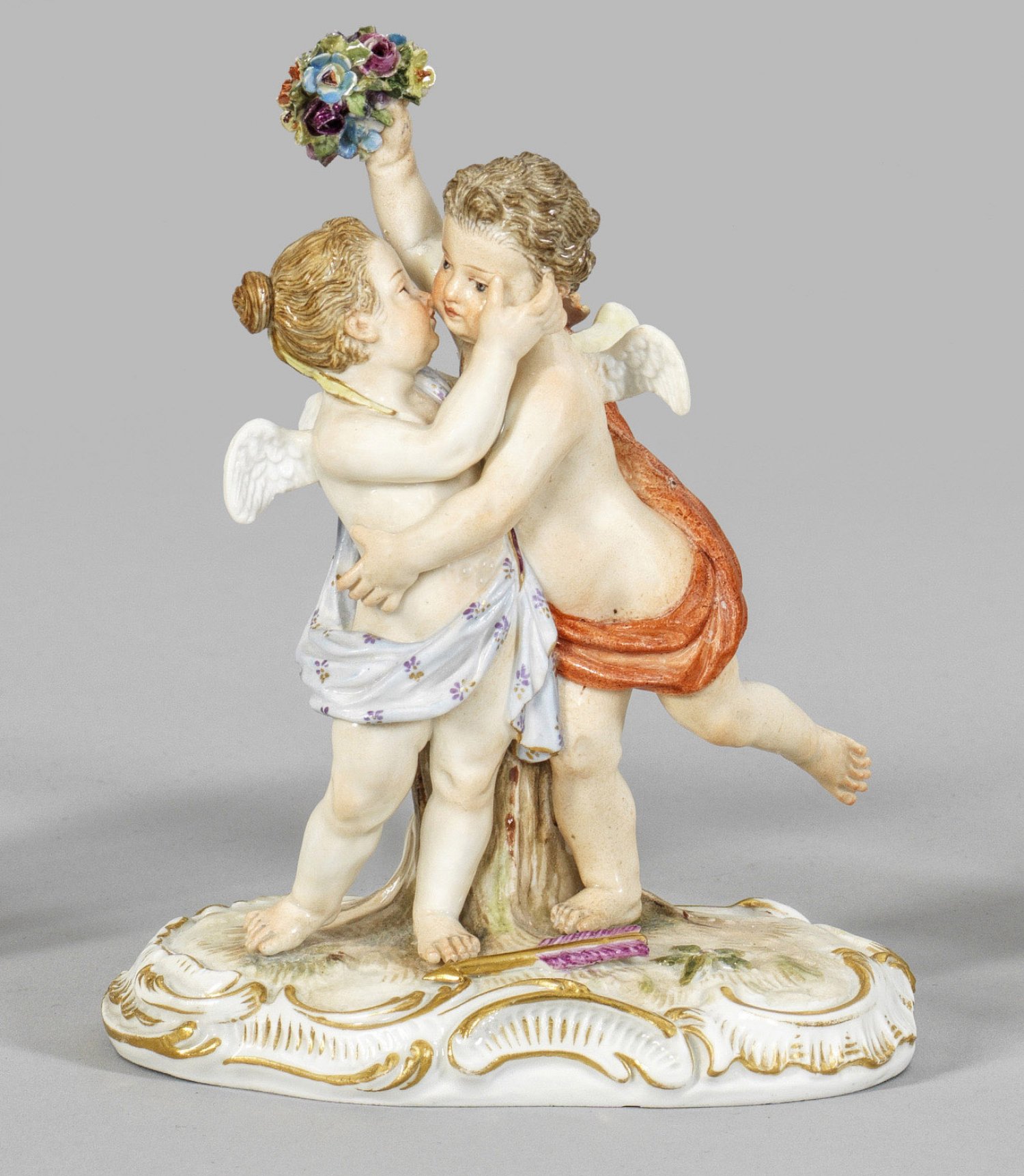 Amorettenpaar Ovaler, rocaillereliefierter Sockel. An einem Baumstamm stehende, sich umarmende, küssende Amoretten mit blütengemustertem bzw. eisenrotem Lendentuch. Der Knabe in seiner rechten Hand einen plastischen Blütenkranz haltend. Polychrome Malerei mit Goldstaffage. Modell-Nr. 2986. Minim. best./rest.; Schwertermarke. H. 13,5 cm.