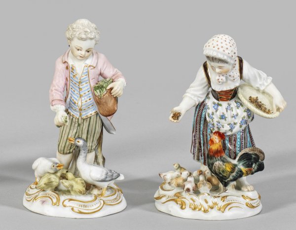 Gänsehirte und Hühnermagd Auf rocaillereliefiertem Sockel, an einem Baumstamm stehender Knabe bzw. Mädchen in sommerlicher Kleidung beim Füttern von Gänsen und Hühnern. Polychrome Malerei mit Goldkonturierung. Entw. Johann Joachim Kaendler. Modell-Nr. C 41 und 2814. Minim. best./rest.; Schwertermarke. H. 11,5 cm - 12,5 cm.