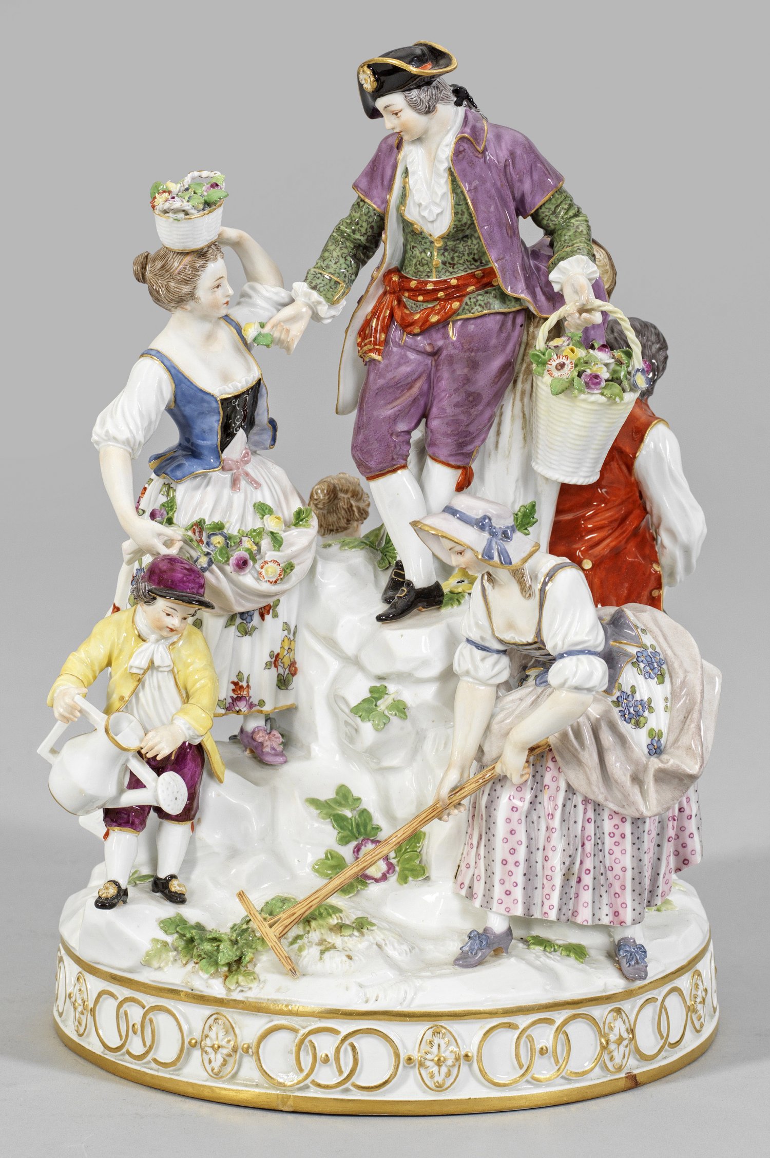 Große Gärtnergruppe Rundsockel mit reliefierter Ornamentbordüre. Über felsig ansteigendem Terrain, auf unterschiedlichen Ebenen komponierte Figurengruppe von stehenden bzw. sitzenden Gärtnern und Gärtnerinnen mit Rechen, Gießkanne, Spaten, Sichel bzw. gefüllten Blumenkörben. Polychrome Malerei mit Goldstaffage. Entw. Michel Victor Acier. Modell-Nr. D 97. Unw. best./rest.; Schwertermarke. H. 28 cm.