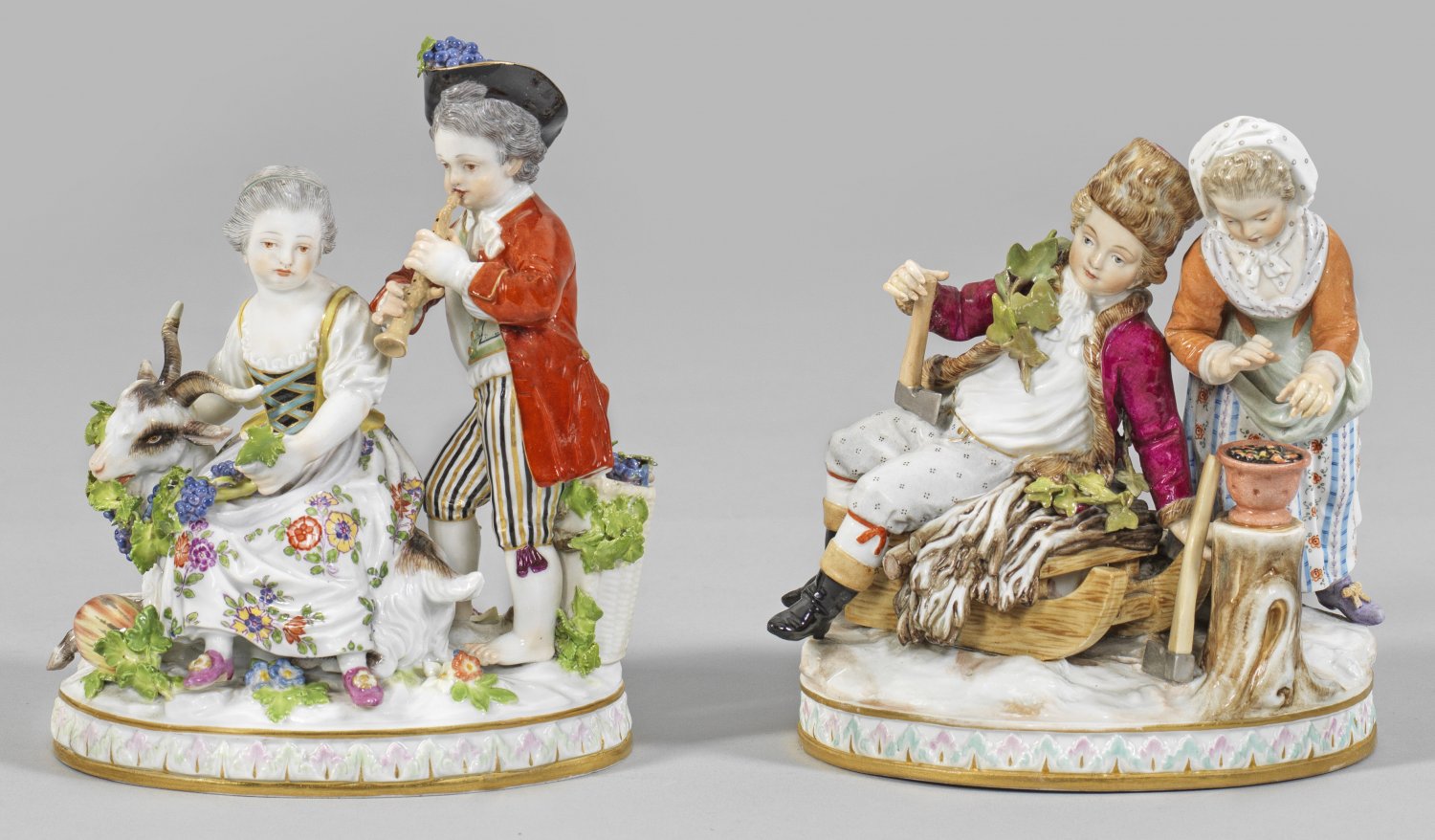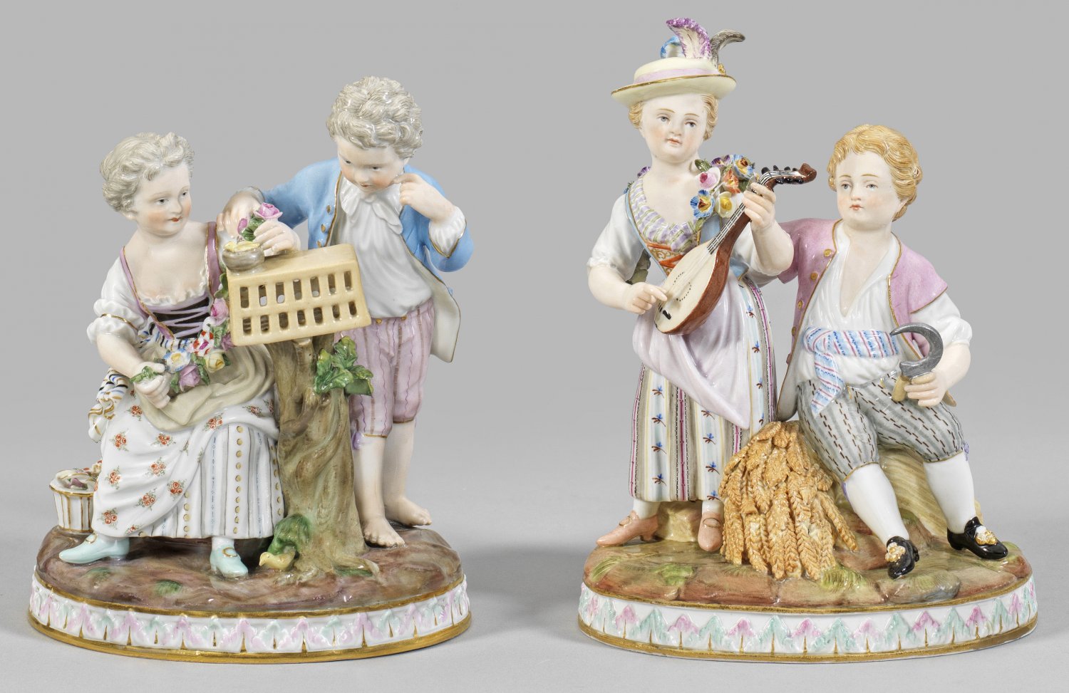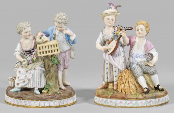 Serie der vier Jahreszeiten mit Gärtnerkindern Auf ovalem Terrainsockel mit reliefierter Palmettenbordüre Kinderpaare als Jahreszeitenallegorien. Mädchen und Knabe mit Blumengirlande und -korb, einen Vogelkäfig mit Vogelnest betrachtend (Frühling); Auf einem Ährenbündel sitzender Knabe in Begleitung eines Mädchens mit Hut und Laute (Sommer); Sitzendes Kind auf einem mit Weinranken behangenem Ziegenbock und Flötenspieler mit Weinkiepe (Herbst); Junge in pelzgefütterter Kleidung auf einem Schlitten mit Mädchen, sich die Hände an der Kohlenschale wärmend (Winter). Polychrome Malerei mit Goldkonturierung. Entw. Johann Joachim Schönheit. Modell-Nr. G 91 - G 94. Unw. besch.; Schwertermarke. H. 14,5 cm - 16,5 cm.