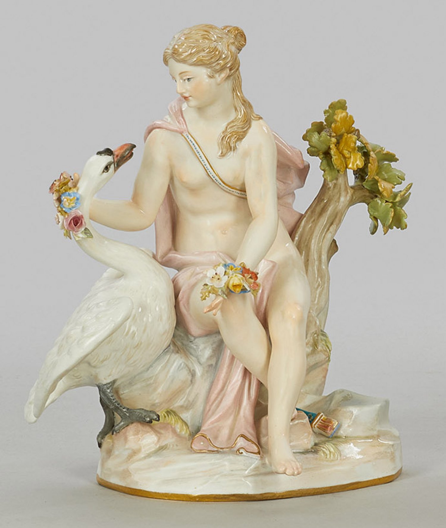 Leda mit dem Schwan Auf einem Felssockel mit Baumstamm sitzende Leda mit rosafarbenem Tuch, einen seitlich stehenden Schwan mit einer Blütengirlande schmückend. Polychrome Malerei mit dezenter Goldkonturierung. Entw. Friedrich Elias Meyer. Modell-Nr. 433. Minim. best.; Rest.; Schwertermarke. H. 17 cm.